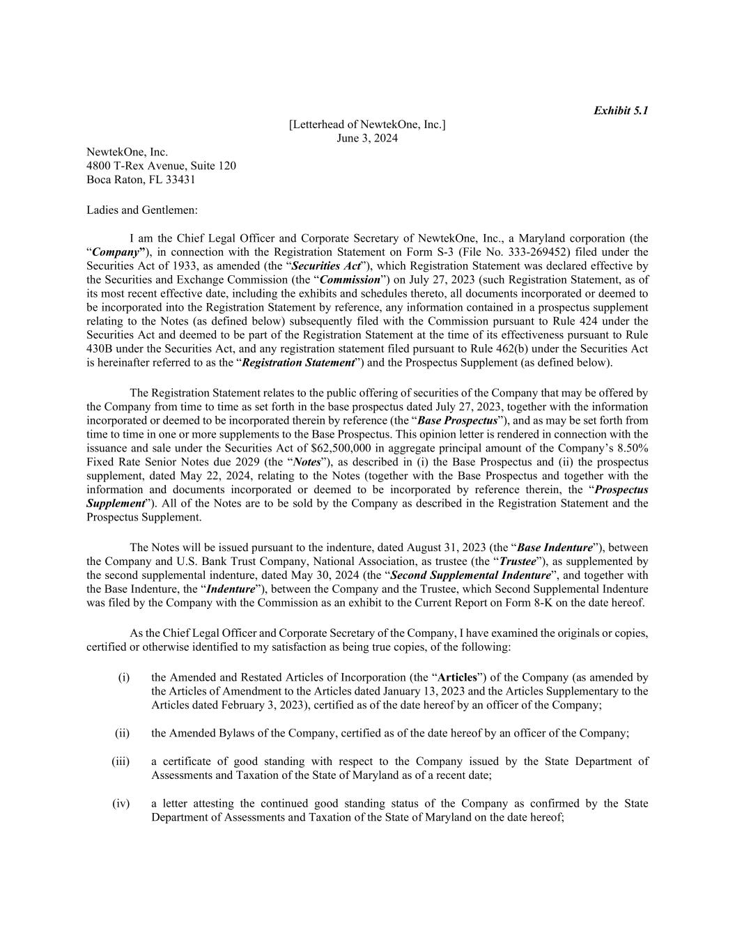 Exhibit 5.1 [Letterhead of NewtekOne, Inc.] June 3, 2024 NewtekOne, Inc. 4800 T-Rex Avenue, Suite 120 Boca Raton, FL 33431 Ladies and Gentlemen: I am the Chief Legal Officer and Corporate Secretary of NewtekOne, Inc., a Maryland corporation (the “Company”), in connection with the Registration Statement on Form S-3 (File No. 333-269452) filed under the Securities Act of 1933, as amended (the “Securities Act”), which Registration Statement was declared effective by the Securities and Exchange Commission (the “Commission”) on July 27, 2023 (such Registration Statement, as of its most recent effective date, including the exhibits and schedules thereto, all documents incorporated or deemed to be incorporated into the Registration Statement by reference, any information contained in a prospectus supplement relating to the Notes (as defined below) subsequently filed with the Commission pursuant to Rule 424 under the Securities Act and deemed to be part of the Registration Statement at the time of its effectiveness pursuant to Rule 430B under the Securities Act, and any registration statement filed pursuant to Rule 462(b) under the Securities Act is hereinafter referred to as the “Registration Statement”) and the Prospectus Supplement (as defined below). The Registration Statement relates to the public offering of securities of the Company that may be offered by the Company from time to time as set forth in the base prospectus dated July 27, 2023, together with the information incorporated or deemed to be incorporated therein by reference (the “Base Prospectus”), and as may be set forth from time to time in one or more supplements to the Base Prospectus. This opinion letter is rendered in connection with the issuance and sale under the Securities Act of $62,500,000 in aggregate principal amount of the Company’s 8.50% Fixed Rate Senior Notes due 2029 (the “Notes”), as described in (i) the Base Prospectus and (ii) the prospectus supplement, dated May 22, 2024, relating to the Notes (together with the Base Prospectus and together with the information and documents incorporated or deemed to be incorporated by reference therein, the “Prospectus Supplement”). All of the Notes are to be sold by the Company as described in the Registration Statement and the Prospectus Supplement. The Notes will be issued pursuant to the indenture, dated August 31, 2023 (the “Base Indenture”), between the Company and U.S. Bank Trust Company, National Association, as trustee (the “Trustee”), as supplemented by the second supplemental indenture, dated May 30, 2024 (the “Second Supplemental Indenture”, and together with the Base Indenture, the “Indenture”), between the Company and the Trustee, which Second Supplemental Indenture was filed by the Company with the Commission as an exhibit to the Current Report on Form 8-K on the date hereof. As the Chief Legal Officer and Corporate Secretary of the Company, I have examined the originals or copies, certified or otherwise identified to my satisfaction as being true copies, of the following: (i) the Amended and Restated Articles of Incorporation (the “Articles”) of the Company (as amended by the Articles of Amendment to the Articles dated January 13, 2023 and the Articles Supplementary to the Articles dated February 3, 2023), certified as of the date hereof by an officer of the Company; (ii) the Amended Bylaws of the Company, certified as of the date hereof by an officer of the Company; (iii) a certificate of good standing with respect to the Company issued by the State Department of Assessments and Taxation of the State of Maryland as of a recent date; (iv) a letter attesting the continued good standing status of the Company as confirmed by the State Department of Assessments and Taxation of the State of Maryland on the date hereof;