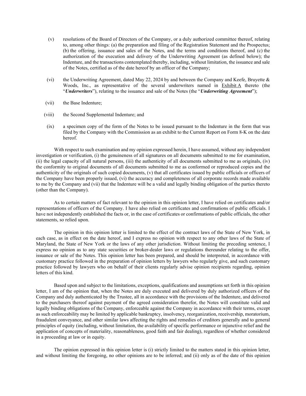 (v) resolutions of the Board of Directors of the Company, or a duly authorized committee thereof, relating to, among other things: (a) the preparation and filing of the Registration Statement and the Prospectus; (b) the offering, issuance and sales of the Notes, and the terms and conditions thereof, and (c) the authorization of the execution and delivery of the Underwriting Agreement (as defined below); the Indenture, and the transactions contemplated thereby, including, without limitation, the issuance and sale of the Notes, certified as of the date hereof by an officer of the Company; (vi) the Underwriting Agreement, dated May 22, 2024 by and between the Company and Keefe, Bruyette & Woods, Inc., as representative of the several underwriters named in Exhibit A thereto (the “Underwriters”), relating to the issuance and sale of the Notes (the “Underwriting Agreement”); (vii) the Base Indenture; (viii) the Second Supplemental Indenture; and (ix) a specimen copy of the form of the Notes to be issued pursuant to the Indenture in the form that was filed by the Company with the Commission as an exhibit to the Current Report on Form 8-K on the date hereof. With respect to such examination and my opinion expressed herein, I have assumed, without any independent investigation or verification, (i) the genuineness of all signatures on all documents submitted to me for examination, (ii) the legal capacity of all natural persons, (iii) the authenticity of all documents submitted to me as originals, (iv) the conformity to original documents of all documents submitted to me as conformed or reproduced copies and the authenticity of the originals of such copied documents, (v) that all certificates issued by public officials or officers of the Company have been properly issued, (vi) the accuracy and completeness of all corporate records made available to me by the Company and (vii) that the Indenture will be a valid and legally binding obligation of the parties thereto (other than the Company). As to certain matters of fact relevant to the opinion in this opinion letter, I have relied on certificates and/or representations of officers of the Company. I have also relied on certificates and confirmations of public officials. I have not independently established the facts or, in the case of certificates or confirmations of public officials, the other statements, so relied upon. The opinion in this opinion letter is limited to the effect of the contract laws of the State of New York, in each case, as in effect on the date hereof, and I express no opinion with respect to any other laws of the State of Maryland, the State of New York or the laws of any other jurisdiction. Without limiting the preceding sentence, I express no opinion as to any state securities or broker-dealer laws or regulations thereunder relating to the offer, issuance or sale of the Notes. This opinion letter has been prepared, and should be interpreted, in accordance with customary practice followed in the preparation of opinion letters by lawyers who regularly give, and such customary practice followed by lawyers who on behalf of their clients regularly advise opinion recipients regarding, opinion letters of this kind. Based upon and subject to the limitations, exceptions, qualifications and assumptions set forth in this opinion letter, I am of the opinion that, when the Notes are duly executed and delivered by duly authorized officers of the Company and duly authenticated by the Trustee, all in accordance with the provisions of the Indenture, and delivered to the purchasers thereof against payment of the agreed consideration therefor, the Notes will constitute valid and legally binding obligations of the Company, enforceable against the Company in accordance with their terms, except as such enforceability may be limited by applicable bankruptcy, insolvency, reorganization, receivership, moratorium, fraudulent conveyance, and other similar laws affecting the rights and remedies of creditors generally and to general principles of equity (including, without limitation, the availability of specific performance or injunctive relief and the application of concepts of materiality, reasonableness, good faith and fair dealing), regardless of whether considered in a proceeding at law or in equity. The opinion expressed in this opinion letter is (i) strictly limited to the matters stated in this opinion letter, and without limiting the foregoing, no other opinions are to be inferred; and (ii) only as of the date of this opinion
