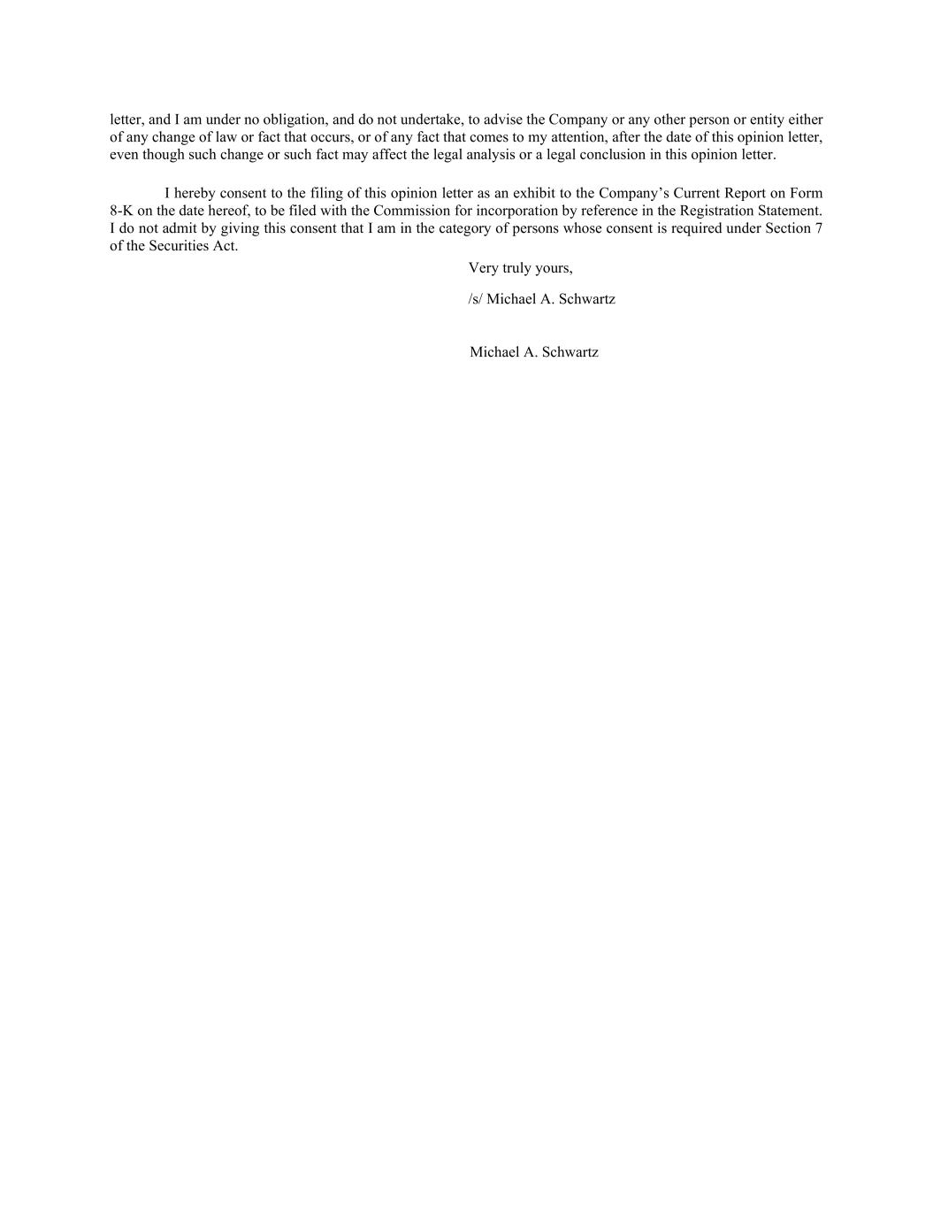 letter, and I am under no obligation, and do not undertake, to advise the Company or any other person or entity either of any change of law or fact that occurs, or of any fact that comes to my attention, after the date of this opinion letter, even though such change or such fact may affect the legal analysis or a legal conclusion in this opinion letter. I hereby consent to the filing of this opinion letter as an exhibit to the Company’s Current Report on Form 8-K on the date hereof, to be filed with the Commission for incorporation by reference in the Registration Statement. I do not admit by giving this consent that I am in the category of persons whose consent is required under Section 7 of the Securities Act. Very truly yours, /s/ Michael A. Schwartz Michael A. Schwartz