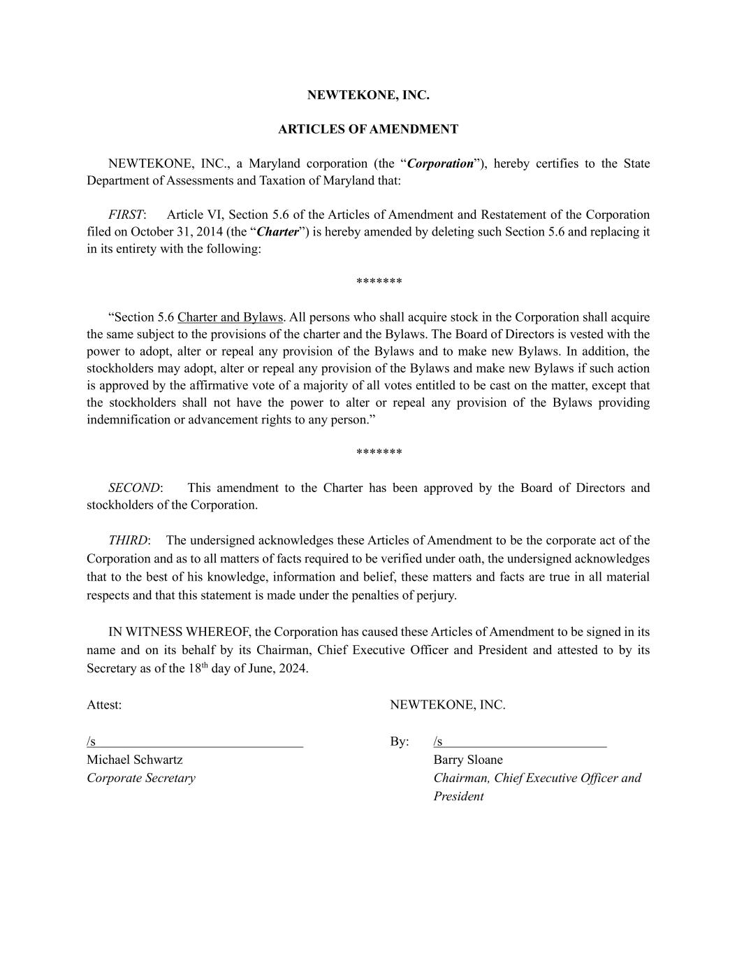 NEWTEKONE, INC. ARTICLES OF AMENDMENT NEWTEKONE, INC., a Maryland corporation (the “Corporation”), hereby certifies to the State Department of Assessments and Taxation of Maryland that: FIRST: Article VI, Section 5.6 of the Articles of Amendment and Restatement of the Corporation filed on October 31, 2014 (the “Charter”) is hereby amended by deleting such Section 5.6 and replacing it in its entirety with the following: ******* “Section 5.6 Charter and Bylaws. All persons who shall acquire stock in the Corporation shall acquire the same subject to the provisions of the charter and the Bylaws. The Board of Directors is vested with the power to adopt, alter or repeal any provision of the Bylaws and to make new Bylaws. In addition, the stockholders may adopt, alter or repeal any provision of the Bylaws and make new Bylaws if such action is approved by the affirmative vote of a majority of all votes entitled to be cast on the matter, except that the stockholders shall not have the power to alter or repeal any provision of the Bylaws providing indemnification or advancement rights to any person.” ******* SECOND: This amendment to the Charter has been approved by the Board of Directors and stockholders of the Corporation. THIRD: The undersigned acknowledges these Articles of Amendment to be the corporate act of the Corporation and as to all matters of facts required to be verified under oath, the undersigned acknowledges that to the best of his knowledge, information and belief, these matters and facts are true in all material respects and that this statement is made under the penalties of perjury. IN WITNESS WHEREOF, the Corporation has caused these Articles of Amendment to be signed in its name and on its behalf by its Chairman, Chief Executive Officer and President and attested to by its Secretary as of the 18th day of June, 2024. Attest: NEWTEKONE, INC. /s By: /s Michael Schwartz Barry Sloane Corporate Secretary Chairman, Chief Executive Officer and President
