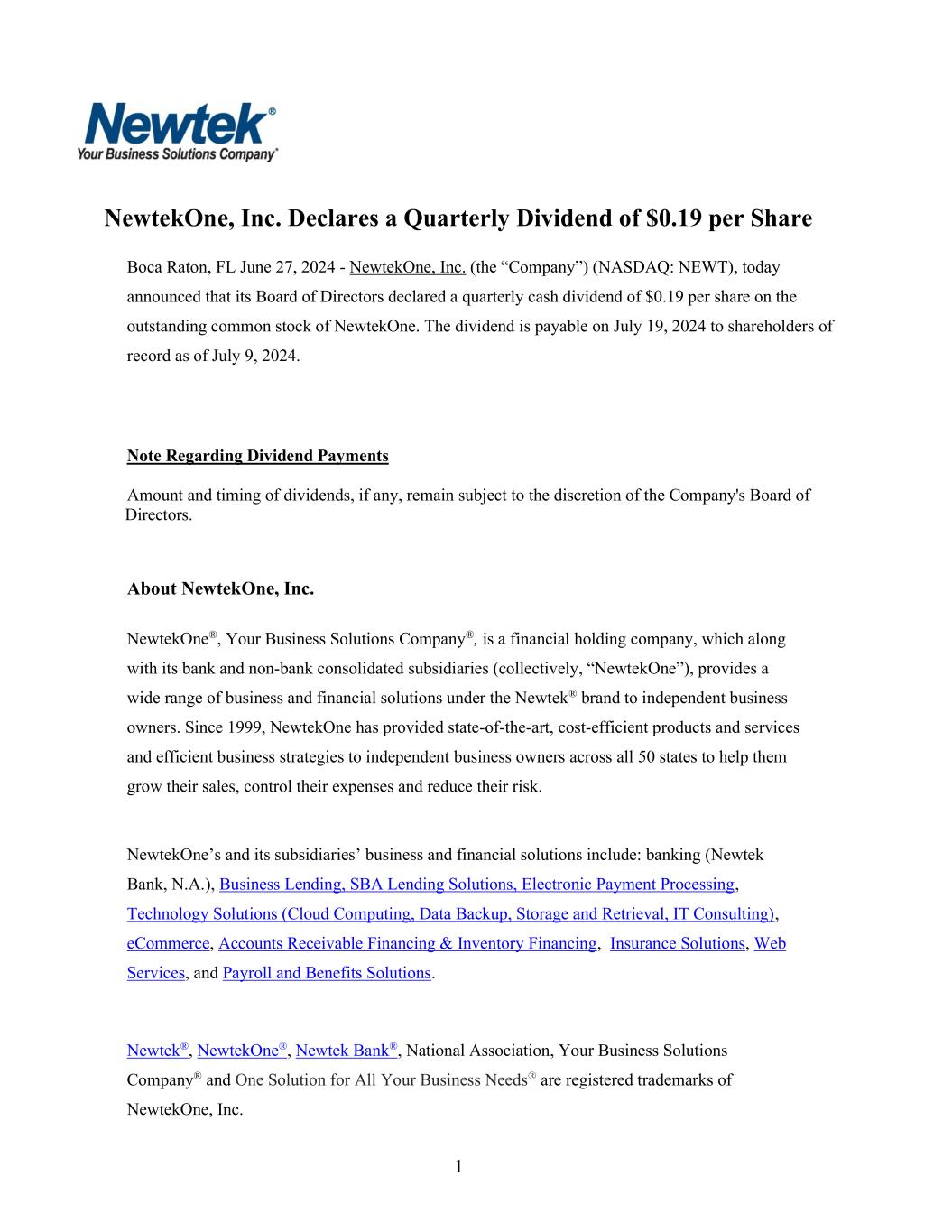 1 NewtekOne, Inc. Declares a Quarterly Dividend of $0.19 per Share Note Regarding Dividend Payments Amount and timing of dividends, if any, remain subject to the discretion of the Company's Board of Directors. About NewtekOne, Inc. NewtekOne®, Your Business Solutions Company®, is a financial holding company, which along with its bank and non-bank consolidated subsidiaries (collectively, “NewtekOne”), provides a wide range of business and financial solutions under the Newtek® brand to independent business owners. Since 1999, NewtekOne has provided state-of-the-art, cost-efficient products and services and efficient business strategies to independent business owners across all 50 states to help them grow their sales, control their expenses and reduce their risk. NewtekOne’s and its subsidiaries’ business and financial solutions include: banking (Newtek Bank, N.A.), Business Lending, SBA Lending Solutions, Electronic Payment Processing, Technology Solutions (Cloud Computing, Data Backup, Storage and Retrieval, IT Consulting), eCommerce, Accounts Receivable Financing & Inventory Financing, Insurance Solutions, Web Services, and Payroll and Benefits Solutions. Newtek®, NewtekOne®, Newtek Bank®, National Association, Your Business Solutions Company® and One Solution for All Your Business Needs® are registered trademarks of NewtekOne, Inc. record as of July 9, 2024. outstanding common stock of NewtekOne. The dividend is payable on July 19, 2024 to shareholders of announced that its Board of Directors declared a quarterly cash dividend of $0.19 per share on the Boca Raton, FL June 27, 2024 - NewtekOne, Inc. (the “Company”) (NASDAQ: NEWT), today