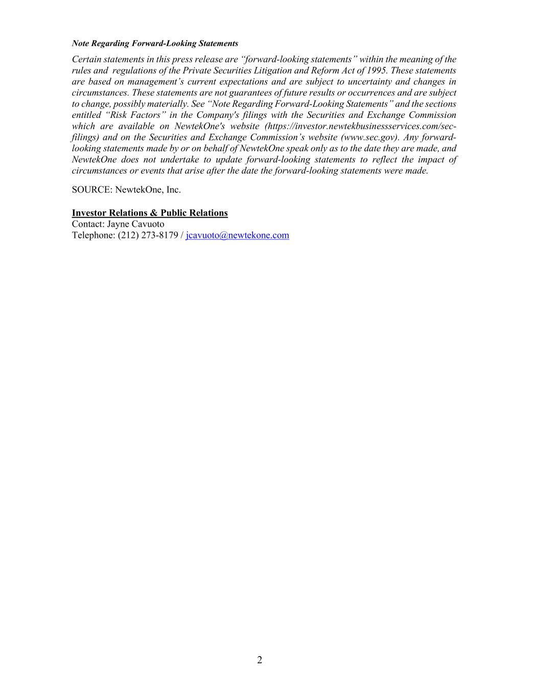 2 Note Regarding Forward-Looking Statements Certain statements in this press release are “forward-looking statements” within the meaning of the rules and regulations of the Private Securities Litigation and Reform Act of 1995. These statements are based on management’s current expectations and are subject to uncertainty and changes in circumstances. These statements are not guarantees of future results or occurrences and are subject to change, possibly materially. See “Note Regarding Forward-Looking Statements” and the sections entitled “Risk Factors” in the Company's filings with the Securities and Exchange Commission which are available on NewtekOne's website (https://investor.newtekbusinessservices.com/sec- filings) and on the Securities and Exchange Commission’s website (www.sec.gov). Any forward- looking statements made by or on behalf of NewtekOne speak only as to the date they are made, and NewtekOne does not undertake to update forward-looking statements to reflect the impact of circumstances or events that arise after the date the forward-looking statements were made. SOURCE: NewtekOne, Inc. Investor Relations & Public Relations Contact: Jayne Cavuoto Telephone: (212) 273-8179 / jcavuoto@newtekone.com