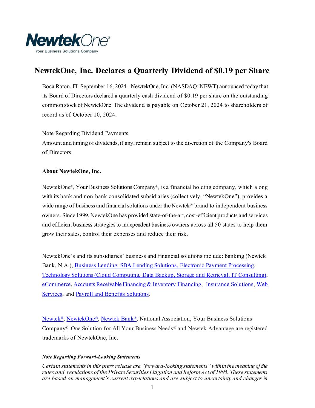 EX-99.1 2 quarterlydividendq32024a.htm EX-99.1 quarterlydividendq32024a