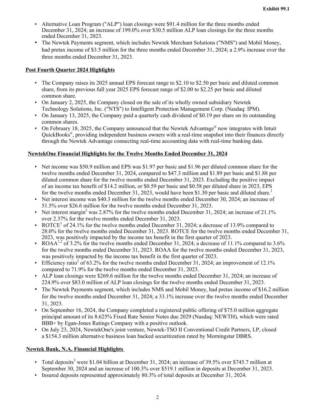 • Alternative Loan Program ("ALP") loan closings were $91.4 million for the three months ended December 31, 2024; an increase of 199.0% over $30.5 million ALP loan closings for the three months ended December 31, 2023. • The Newtek Payments segment, which includes Newtek Merchant Solutions ("NMS") and Mobil Money, had pretax income of $3.5 million for the three months ended December 31, 2024; a 2.9% increase over the three months ended December 31, 2023. Post Fourth Quarter 2024 Highlights • The Company raises its 2025 annual EPS forecast range to $2.10 to $2.50 per basic and diluted common share, from its previous full year 2025 EPS forecast range of $2.00 to $2.25 per basic and diluted common share. • On January 2, 2025, the Company closed on the sale of its wholly owned subsidiary Newtek Technology Solutions, Inc. ("NTS") to Intelligent Protection Management Corp. (Nasdaq: IPM). • On January 13, 2025, the Company paid a quarterly cash dividend of $0.19 per share on its outstanding common shares. • On February 18, 2025, the Company announced that the Newtek Advantage® now integrates with Intuit QuickBooks®, providing independent business owners with a real-time snapshot into their finances directly through the Newtek Advantage connecting real-time accounting data with real-time banking data. NewtekOne Financial Highlights for the Twelve Months Ended December 31, 2024 • Net income was $50.9 million and EPS was $1.97 per basic and $1.96 per diluted common share for the twelve months ended December 31, 2024, compared to $47.3 million and $1.89 per basic and $1.88 per diluted common share for the twelve months ended December 31, 2023. Excluding the positive impact of an income tax benefit of $14.2 million, or $0.59 per basic and $0.58 per diluted share in 2023, EPS for the twelve months ended December 31, 2023, would have been $1.30 per basic and diluted share.1 • Net interest income was $40.3 million for the twelve months ended December 30, 2024; an increase of 51.5% over $26.6 million for the twelve months ended December 31, 2023. • Net interest margin2 was 2.87% for the twelve months ended December 31, 2024; an increase of 21.1% over 2.37% for the twelve months ended December 31, 2023. • ROTCE1 of 24.1% for the twelve months ended December 31, 2024; a decrease of 13.9% compared to 28.0% for the twelve months ended December 31, 2023. ROTCE for the twelve months ended December 31, 2023, was positively impacted by the income tax benefit in the first quarter of 2023. • ROAA1,2 of 3.2% for the twelve months ended December 31, 2024; a decrease of 11.1% compared to 3.6% for the twelve months ended December 31, 2023. ROAA for the twelve months ended December 31, 2023, was positively impacted by the income tax benefit in the first quarter of 2023. • Efficiency ratio2 of 63.2% for the twelve months ended December 31, 2024; an improvement of 12.1% compared to 71.9% for the twelve months ended December 31, 2023. • ALP loan closings were $269.6 million for the twelve months ended December 31, 2024; an increase of 224.9% over $83.0 million of ALP loan closings for the twelve months ended December 31, 2023. • The Newtek Payments segment, which includes NMS and Mobil Money, had pretax income of $16.2 million for the twelve months ended December 31, 2024; a 33.1% increase over the twelve months ended December 31, 2023. • On September 16, 2024, the Company completed a registered public offering of $75.0 million aggregate principal amount of its 8.625% Fixed Rate Senior Notes due 2029 (Nasdaq: NEWTH), which were rated BBB+ by Egan-Jones Ratings Company with a positive outlook. • On July 23, 2024, NewtekOne's joint venture, Newtek-TSO II Conventional Credit Partners, LP, closed a $154.3 million alternative business loan backed securitization rated by Morningstar DBRS. Newtek Bank, N.A. Financial Highlights • Total deposits3 were $1.04 billion at December 31, 2024; an increase of 39.5% over $745.7 million at September 30, 2024 and an increase of 100.3% over $519.1 million in deposits at December 31, 2023. • Insured deposits represented approximately 80.3% of total deposits at December 31, 2024. Exhibit 99.1 2
