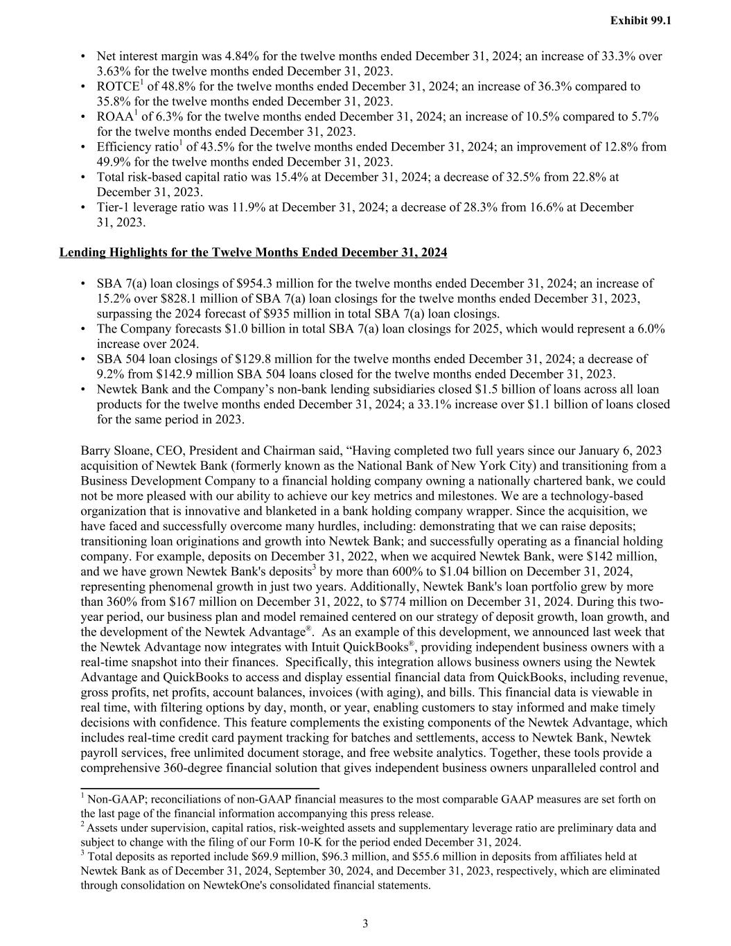 • Net interest margin was 4.84% for the twelve months ended December 31, 2024; an increase of 33.3% over 3.63% for the twelve months ended December 31, 2023. • ROTCE1 of 48.8% for the twelve months ended December 31, 2024; an increase of 36.3% compared to 35.8% for the twelve months ended December 31, 2023. • ROAA1 of 6.3% for the twelve months ended December 31, 2024; an increase of 10.5% compared to 5.7% for the twelve months ended December 31, 2023. • Efficiency ratio1 of 43.5% for the twelve months ended December 31, 2024; an improvement of 12.8% from 49.9% for the twelve months ended December 31, 2023. • Total risk-based capital ratio was 15.4% at December 31, 2024; a decrease of 32.5% from 22.8% at December 31, 2023. • Tier-1 leverage ratio was 11.9% at December 31, 2024; a decrease of 28.3% from 16.6% at December 31, 2023. Lending Highlights for the Twelve Months Ended December 31, 2024 • SBA 7(a) loan closings of $954.3 million for the twelve months ended December 31, 2024; an increase of 15.2% over $828.1 million of SBA 7(a) loan closings for the twelve months ended December 31, 2023, surpassing the 2024 forecast of $935 million in total SBA 7(a) loan closings. • The Company forecasts $1.0 billion in total SBA 7(a) loan closings for 2025, which would represent a 6.0% increase over 2024. • SBA 504 loan closings of $129.8 million for the twelve months ended December 31, 2024; a decrease of 9.2% from $142.9 million SBA 504 loans closed for the twelve months ended December 31, 2023. • Newtek Bank and the Company’s non-bank lending subsidiaries closed $1.5 billion of loans across all loan products for the twelve months ended December 31, 2024; a 33.1% increase over $1.1 billion of loans closed for the same period in 2023. Barry Sloane, CEO, President and Chairman said, “Having completed two full years since our January 6, 2023 acquisition of Newtek Bank (formerly known as the National Bank of New York City) and transitioning from a Business Development Company to a financial holding company owning a nationally chartered bank, we could not be more pleased with our ability to achieve our key metrics and milestones. We are a technology-based organization that is innovative and blanketed in a bank holding company wrapper. Since the acquisition, we have faced and successfully overcome many hurdles, including: demonstrating that we can raise deposits; transitioning loan originations and growth into Newtek Bank; and successfully operating as a financial holding company. For example, deposits on December 31, 2022, when we acquired Newtek Bank, were $142 million, and we have grown Newtek Bank's deposits3 by more than 600% to $1.04 billion on December 31, 2024, representing phenomenal growth in just two years. Additionally, Newtek Bank's loan portfolio grew by more than 360% from $167 million on December 31, 2022, to $774 million on December 31, 2024. During this two- year period, our business plan and model remained centered on our strategy of deposit growth, loan growth, and the development of the Newtek Advantage®. As an example of this development, we announced last week that the Newtek Advantage now integrates with Intuit QuickBooks®, providing independent business owners with a real-time snapshot into their finances. Specifically, this integration allows business owners using the Newtek Advantage and QuickBooks to access and display essential financial data from QuickBooks, including revenue, gross profits, net profits, account balances, invoices (with aging), and bills. This financial data is viewable in real time, with filtering options by day, month, or year, enabling customers to stay informed and make timely decisions with confidence. This feature complements the existing components of the Newtek Advantage, which includes real-time credit card payment tracking for batches and settlements, access to Newtek Bank, Newtek payroll services, free unlimited document storage, and free website analytics. Together, these tools provide a comprehensive 360-degree financial solution that gives independent business owners unparalleled control and Exhibit 99.1 3 1 Non-GAAP; reconciliations of non-GAAP financial measures to the most comparable GAAP measures are set forth on the last page of the financial information accompanying this press release. 2 Assets under supervision, capital ratios, risk-weighted assets and supplementary leverage ratio are preliminary data and subject to change with the filing of our Form 10-K for the period ended December 31, 2024. 3 Total deposits as reported include $69.9 million, $96.3 million, and $55.6 million in deposits from affiliates held at Newtek Bank as of December 31, 2024, September 30, 2024, and December 31, 2023, respectively, which are eliminated through consolidation on NewtekOne's consolidated financial statements.