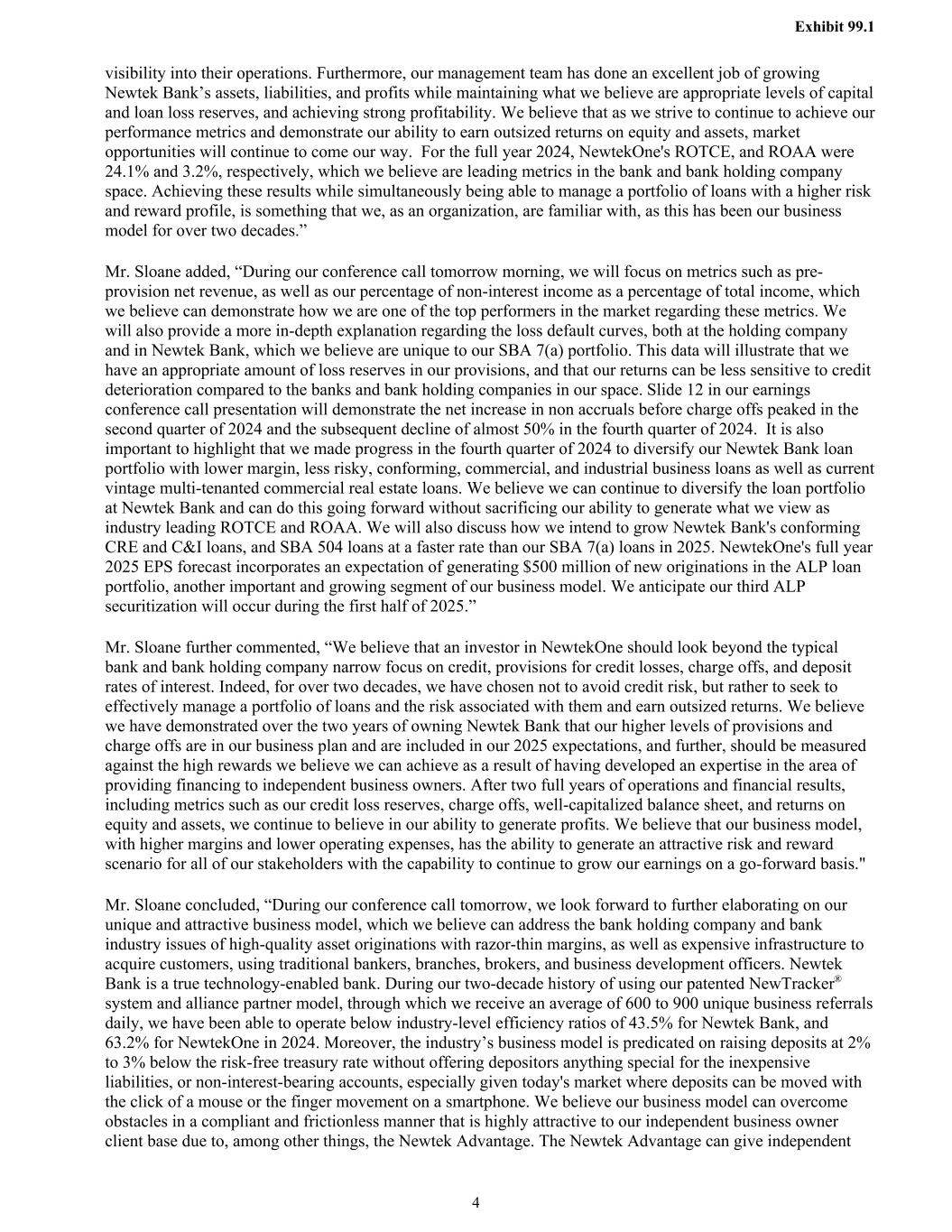 visibility into their operations. Furthermore, our management team has done an excellent job of growing Newtek Bank’s assets, liabilities, and profits while maintaining what we believe are appropriate levels of capital and loan loss reserves, and achieving strong profitability. We believe that as we strive to continue to achieve our performance metrics and demonstrate our ability to earn outsized returns on equity and assets, market opportunities will continue to come our way. For the full year 2024, NewtekOne's ROTCE, and ROAA were 24.1% and 3.2%, respectively, which we believe are leading metrics in the bank and bank holding company space. Achieving these results while simultaneously being able to manage a portfolio of loans with a higher risk and reward profile, is something that we, as an organization, are familiar with, as this has been our business model for over two decades.” Mr. Sloane added, “During our conference call tomorrow morning, we will focus on metrics such as pre- provision net revenue, as well as our percentage of non-interest income as a percentage of total income, which we believe can demonstrate how we are one of the top performers in the market regarding these metrics. We will also provide a more in-depth explanation regarding the loss default curves, both at the holding company and in Newtek Bank, which we believe are unique to our SBA 7(a) portfolio. This data will illustrate that we have an appropriate amount of loss reserves in our provisions, and that our returns can be less sensitive to credit deterioration compared to the banks and bank holding companies in our space. Slide 12 in our earnings conference call presentation will demonstrate the net increase in non accruals before charge offs peaked in the second quarter of 2024 and the subsequent decline of almost 50% in the fourth quarter of 2024. It is also important to highlight that we made progress in the fourth quarter of 2024 to diversify our Newtek Bank loan portfolio with lower margin, less risky, conforming, commercial, and industrial business loans as well as current vintage multi-tenanted commercial real estate loans. We believe we can continue to diversify the loan portfolio at Newtek Bank and can do this going forward without sacrificing our ability to generate what we view as industry leading ROTCE and ROAA. We will also discuss how we intend to grow Newtek Bank's conforming CRE and C&I loans, and SBA 504 loans at a faster rate than our SBA 7(a) loans in 2025. NewtekOne's full year 2025 EPS forecast incorporates an expectation of generating $500 million of new originations in the ALP loan portfolio, another important and growing segment of our business model. We anticipate our third ALP securitization will occur during the first half of 2025.” Mr. Sloane further commented, “We believe that an investor in NewtekOne should look beyond the typical bank and bank holding company narrow focus on credit, provisions for credit losses, charge offs, and deposit rates of interest. Indeed, for over two decades, we have chosen not to avoid credit risk, but rather to seek to effectively manage a portfolio of loans and the risk associated with them and earn outsized returns. We believe we have demonstrated over the two years of owning Newtek Bank that our higher levels of provisions and charge offs are in our business plan and are included in our 2025 expectations, and further, should be measured against the high rewards we believe we can achieve as a result of having developed an expertise in the area of providing financing to independent business owners. After two full years of operations and financial results, including metrics such as our credit loss reserves, charge offs, well-capitalized balance sheet, and returns on equity and assets, we continue to believe in our ability to generate profits. We believe that our business model, with higher margins and lower operating expenses, has the ability to generate an attractive risk and reward scenario for all of our stakeholders with the capability to continue to grow our earnings on a go-forward basis." Mr. Sloane concluded, “During our conference call tomorrow, we look forward to further elaborating on our unique and attractive business model, which we believe can address the bank holding company and bank industry issues of high-quality asset originations with razor-thin margins, as well as expensive infrastructure to acquire customers, using traditional bankers, branches, brokers, and business development officers. Newtek Bank is a true technology-enabled bank. During our two-decade history of using our patented NewTracker® system and alliance partner model, through which we receive an average of 600 to 900 unique business referrals daily, we have been able to operate below industry-level efficiency ratios of 43.5% for Newtek Bank, and 63.2% for NewtekOne in 2024. Moreover, the industry’s business model is predicated on raising deposits at 2% to 3% below the risk-free treasury rate without offering depositors anything special for the inexpensive liabilities, or non-interest-bearing accounts, especially given today's market where deposits can be moved with the click of a mouse or the finger movement on a smartphone. We believe our business model can overcome obstacles in a compliant and frictionless manner that is highly attractive to our independent business owner client base due to, among other things, the Newtek Advantage. The Newtek Advantage can give independent Exhibit 99.1 4