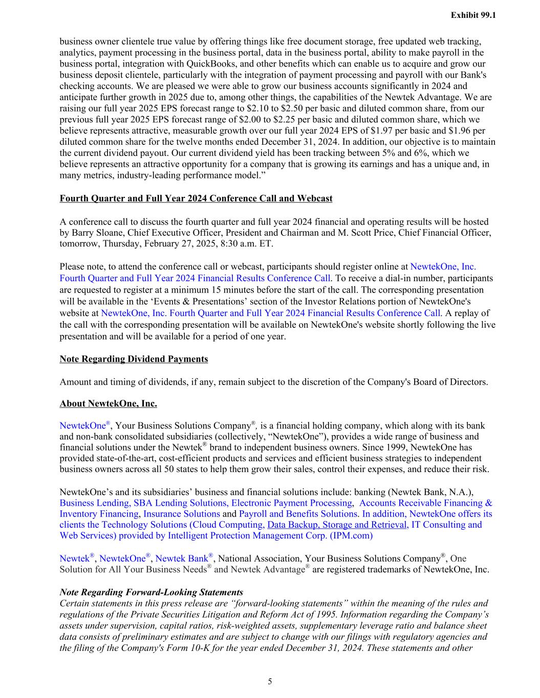 business owner clientele true value by offering things like free document storage, free updated web tracking, analytics, payment processing in the business portal, data in the business portal, ability to make payroll in the business portal, integration with QuickBooks, and other benefits which can enable us to acquire and grow our business deposit clientele, particularly with the integration of payment processing and payroll with our Bank's checking accounts. We are pleased we were able to grow our business accounts significantly in 2024 and anticipate further growth in 2025 due to, among other things, the capabilities of the Newtek Advantage. We are raising our full year 2025 EPS forecast range to $2.10 to $2.50 per basic and diluted common share, from our previous full year 2025 EPS forecast range of $2.00 to $2.25 per basic and diluted common share, which we believe represents attractive, measurable growth over our full year 2024 EPS of $1.97 per basic and $1.96 per diluted common share for the twelve months ended December 31, 2024. In addition, our objective is to maintain the current dividend payout. Our current dividend yield has been tracking between 5% and 6%, which we believe represents an attractive opportunity for a company that is growing its earnings and has a unique and, in many metrics, industry-leading performance model.” Fourth Quarter and Full Year 2024 Conference Call and Webcast A conference call to discuss the fourth quarter and full year 2024 financial and operating results will be hosted by Barry Sloane, Chief Executive Officer, President and Chairman and M. Scott Price, Chief Financial Officer, tomorrow, Thursday, February 27, 2025, 8:30 a.m. ET. Please note, to attend the conference call or webcast, participants should register online at NewtekOne, Inc. Fourth Quarter and Full Year 2024 Financial Results Conference Call. To receive a dial-in number, participants are requested to register at a minimum 15 minutes before the start of the call. The corresponding presentation will be available in the ‘Events & Presentations’ section of the Investor Relations portion of NewtekOne's website at NewtekOne, Inc. Fourth Quarter and Full Year 2024 Financial Results Conference Call. A replay of the call with the corresponding presentation will be available on NewtekOne's website shortly following the live presentation and will be available for a period of one year. Note Regarding Dividend Payments Amount and timing of dividends, if any, remain subject to the discretion of the Company's Board of Directors. About NewtekOne, Inc. NewtekOne®, Your Business Solutions Company®, is a financial holding company, which along with its bank and non-bank consolidated subsidiaries (collectively, “NewtekOne”), provides a wide range of business and financial solutions under the Newtek® brand to independent business owners. Since 1999, NewtekOne has provided state-of-the-art, cost-efficient products and services and efficient business strategies to independent business owners across all 50 states to help them grow their sales, control their expenses, and reduce their risk. NewtekOne’s and its subsidiaries’ business and financial solutions include: banking (Newtek Bank, N.A.), Business Lending, SBA Lending Solutions, Electronic Payment Processing, Accounts Receivable Financing & Inventory Financing, Insurance Solutions and Payroll and Benefits Solutions. In addition, NewtekOne offers its clients the Technology Solutions (Cloud Computing, Data Backup, Storage and Retrieval, IT Consulting and Web Services) provided by Intelligent Protection Management Corp. (IPM.com) Newtek®, NewtekOne®, Newtek Bank®, National Association, Your Business Solutions Company®, One Solution for All Your Business Needs® and Newtek Advantage® are registered trademarks of NewtekOne, Inc. Note Regarding Forward-Looking Statements Certain statements in this press release are “forward-looking statements” within the meaning of the rules and regulations of the Private Securities Litigation and Reform Act of 1995. Information regarding the Company’s assets under supervision, capital ratios, risk-weighted assets, supplementary leverage ratio and balance sheet data consists of preliminary estimates and are subject to change with our filings with regulatory agencies and the filing of the Company's Form 10-K for the year ended December 31, 2024. These statements and other Exhibit 99.1 5