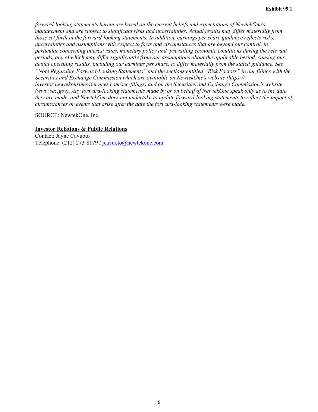 forward-looking statements herein are based on the current beliefs and expectations of NewtekOne's management and are subject to significant risks and uncertainties. Actual results may differ materially from those set forth in the forward-looking statements. In addition, earnings per share guidance reflects risks, uncertainties and assumptions with respect to facts and circumstances that are beyond our control, in particular concerning interest rates, monetary policy and prevailing economic conditions during the relevant periods, any of which may differ significantly from our assumptions about the applicable period, causing our actual operating results, including our earnings per share, to differ materially from the stated guidance. See “Note Regarding Forward-Looking Statements” and the sections entitled “Risk Factors” in our filings with the Securities and Exchange Commission which are available on NewtekOne's website (https:// investor.newtekbusinessservices.com/sec-filings) and on the Securities and Exchange Commission’s website (www.sec.gov). Any forward-looking statements made by or on behalf of NewtekOne speak only as to the date they are made, and NewtekOne does not undertake to update forward-looking statements to reflect the impact of circumstances or events that arise after the date the forward-looking statements were made. SOURCE: NewtekOne, Inc. Investor Relations & Public Relations Contact: Jayne Cavuoto Telephone: (212) 273-8179 / jcavuoto@newtekone.com Exhibit 99.1 6