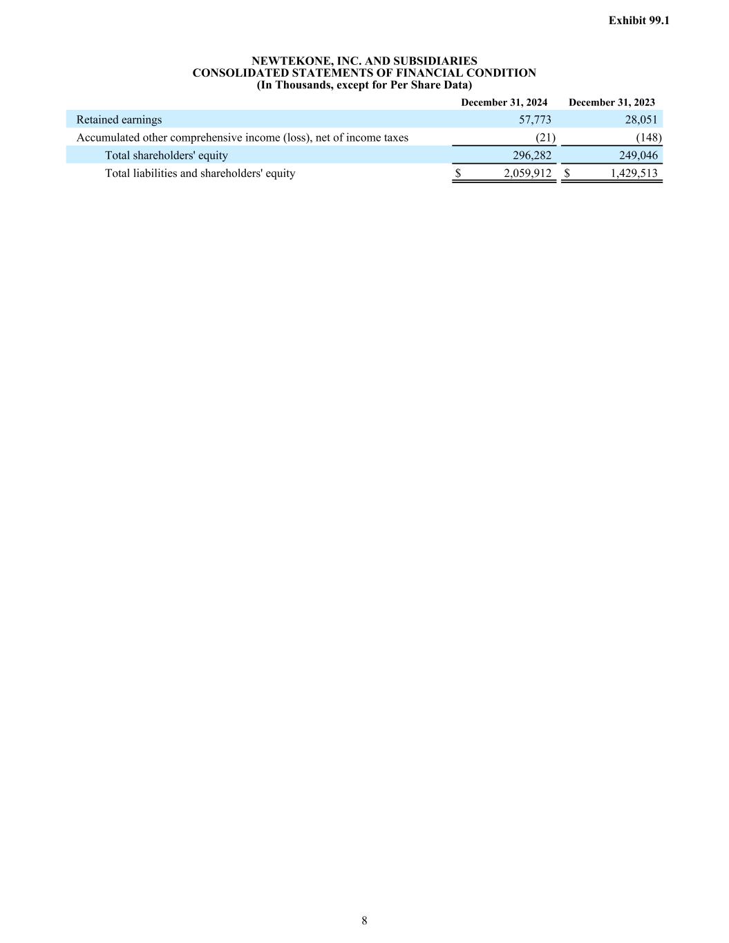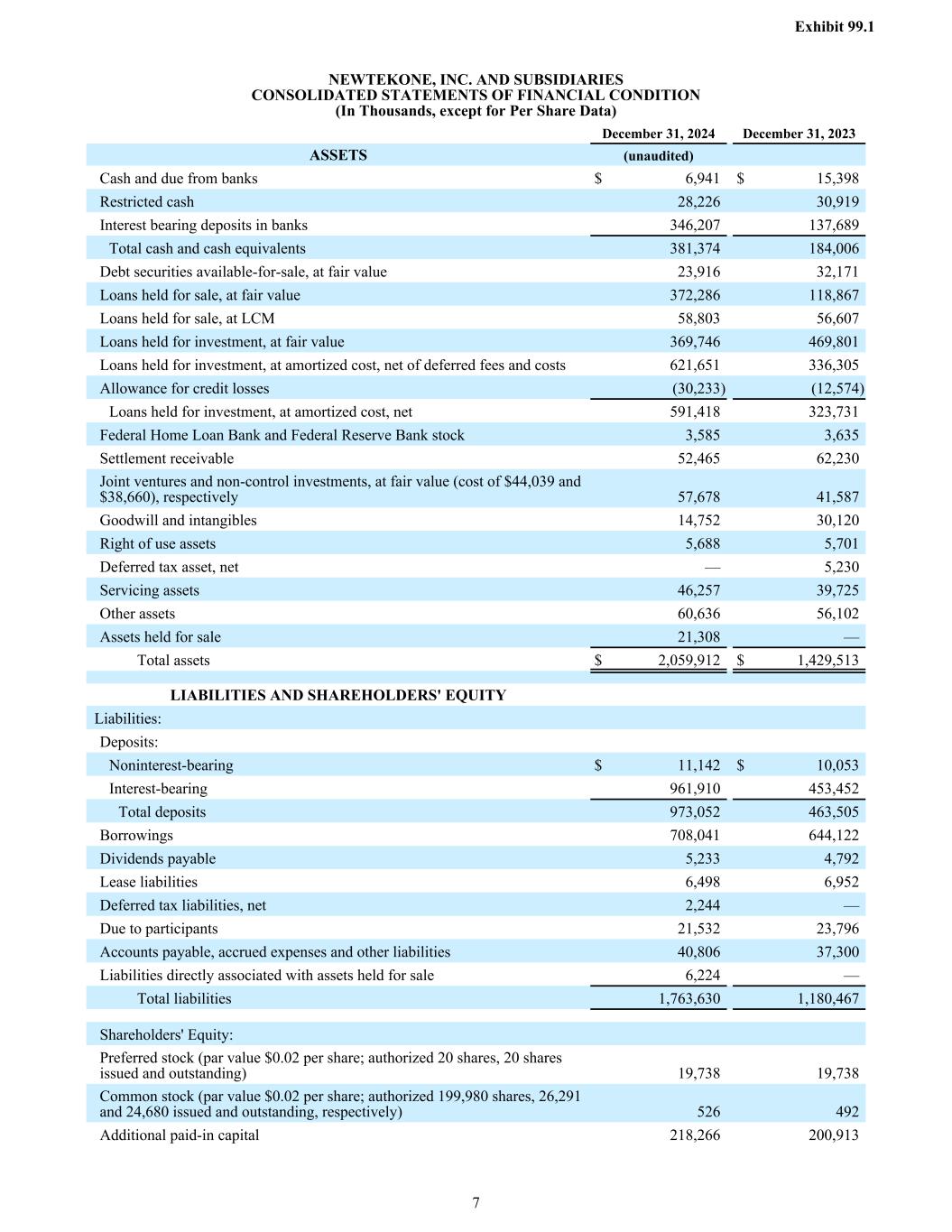 ASSETS (unaudited) Cash and due from banks $ 6,941 $ 15,398 Restricted cash 28,226 30,919 Interest bearing deposits in banks 346,207 137,689 Total cash and cash equivalents 381,374 184,006 Debt securities available-for-sale, at fair value 23,916 32,171 Loans held for sale, at fair value 372,286 118,867 Loans held for sale, at LCM 58,803 56,607 Loans held for investment, at fair value 369,746 469,801 Loans held for investment, at amortized cost, net of deferred fees and costs 621,651 336,305 Allowance for credit losses (30,233) (12,574) Loans held for investment, at amortized cost, net 591,418 323,731 Federal Home Loan Bank and Federal Reserve Bank stock 3,585 3,635 Settlement receivable 52,465 62,230 Joint ventures and non-control investments, at fair value (cost of $44,039 and $38,660), respectively 57,678 41,587 Goodwill and intangibles 14,752 30,120 Right of use assets 5,688 5,701 Deferred tax asset, net — 5,230 Servicing assets 46,257 39,725 Other assets 60,636 56,102 Assets held for sale 21,308 — Total assets $ 2,059,912 $ 1,429,513 LIABILITIES AND SHAREHOLDERS' EQUITY Liabilities: Deposits: Noninterest-bearing $ 11,142 $ 10,053 Interest-bearing 961,910 453,452 Total deposits 973,052 463,505 Borrowings 708,041 644,122 Dividends payable 5,233 4,792 Lease liabilities 6,498 6,952 Deferred tax liabilities, net 2,244 — Due to participants 21,532 23,796 Accounts payable, accrued expenses and other liabilities 40,806 37,300 Liabilities directly associated with assets held for sale 6,224 — Total liabilities 1,763,630 1,180,467 Shareholders' Equity: Preferred stock (par value $0.02 per share; authorized 20 shares, 20 shares issued and outstanding) 19,738 19,738 Common stock (par value $0.02 per share; authorized 199,980 shares, 26,291 and 24,680 issued and outstanding, respectively) 526 492 Additional paid-in capital 218,266 200,913 NEWTEKONE, INC. AND SUBSIDIARIES CONSOLIDATED STATEMENTS OF FINANCIAL CONDITION (In Thousands, except for Per Share Data) December 31, 2024 December 31, 2023 Exhibit 99.1 7