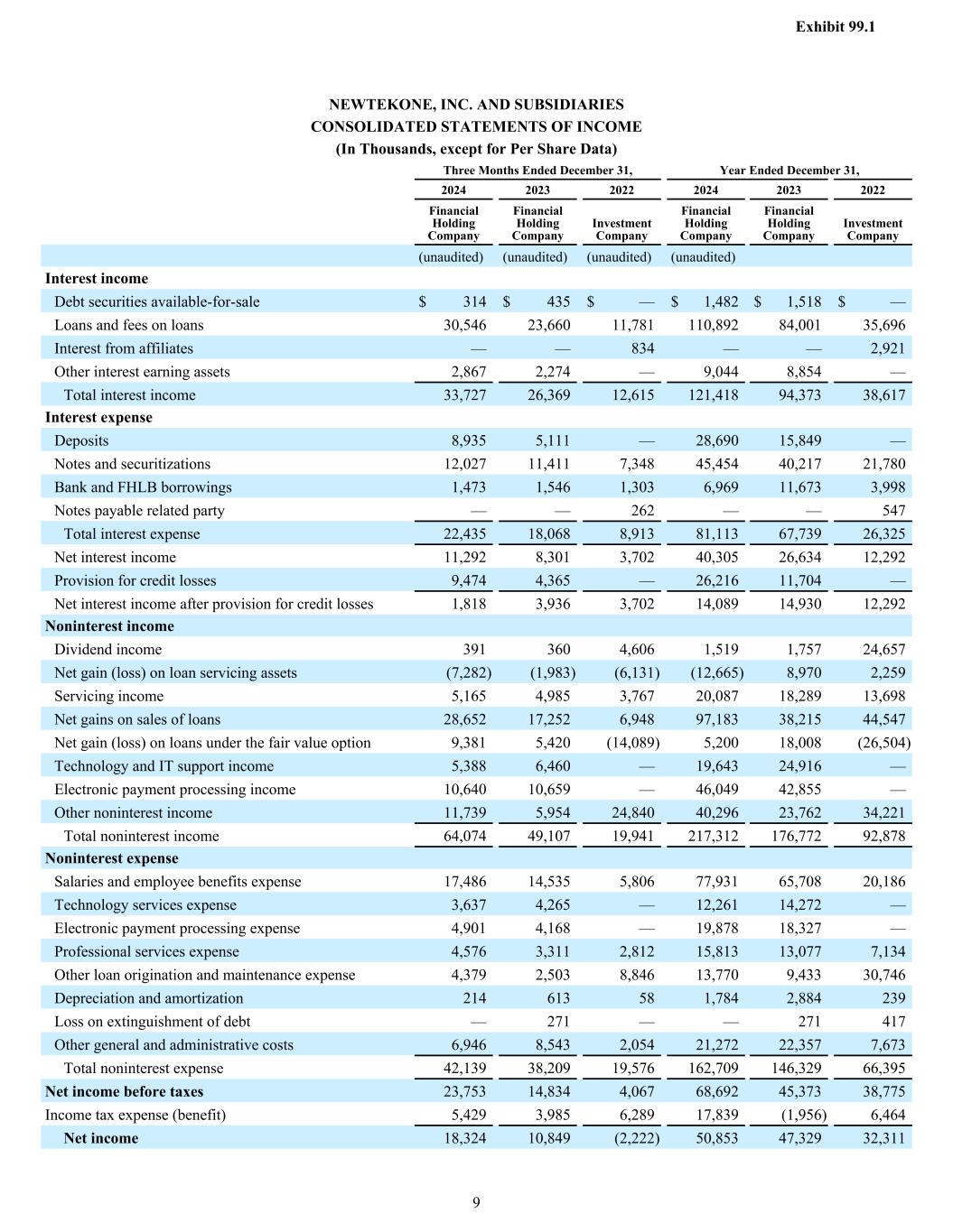 (unaudited) (unaudited) (unaudited) (unaudited) Interest income Debt securities available-for-sale $ 314 $ 435 $ — $ 1,482 $ 1,518 $ — Loans and fees on loans 30,546 23,660 11,781 110,892 84,001 35,696 Interest from affiliates — — 834 — — 2,921 Other interest earning assets 2,867 2,274 — 9,044 8,854 — Total interest income 33,727 26,369 12,615 121,418 94,373 38,617 Interest expense Deposits 8,935 5,111 — 28,690 15,849 — Notes and securitizations 12,027 11,411 7,348 45,454 40,217 21,780 Bank and FHLB borrowings 1,473 1,546 1,303 6,969 11,673 3,998 Notes payable related party — — 262 — — 547 Total interest expense 22,435 18,068 8,913 81,113 67,739 26,325 Net interest income 11,292 8,301 3,702 40,305 26,634 12,292 Provision for credit losses 9,474 4,365 — 26,216 11,704 — Net interest income after provision for credit losses 1,818 3,936 3,702 14,089 14,930 12,292 Noninterest income Dividend income 391 360 4,606 1,519 1,757 24,657 Net gain (loss) on loan servicing assets (7,282) (1,983) (6,131) (12,665) 8,970 2,259 Servicing income 5,165 4,985 3,767 20,087 18,289 13,698 Net gains on sales of loans 28,652 17,252 6,948 97,183 38,215 44,547 Net gain (loss) on loans under the fair value option 9,381 5,420 (14,089) 5,200 18,008 (26,504) Technology and IT support income 5,388 6,460 — 19,643 24,916 — Electronic payment processing income 10,640 10,659 — 46,049 42,855 — Other noninterest income 11,739 5,954 24,840 40,296 23,762 34,221 Total noninterest income 64,074 49,107 19,941 217,312 176,772 92,878 Noninterest expense Salaries and employee benefits expense 17,486 14,535 5,806 77,931 65,708 20,186 Technology services expense 3,637 4,265 — 12,261 14,272 — Electronic payment processing expense 4,901 4,168 — 19,878 18,327 — Professional services expense 4,576 3,311 2,812 15,813 13,077 7,134 Other loan origination and maintenance expense 4,379 2,503 8,846 13,770 9,433 30,746 Depreciation and amortization 214 613 58 1,784 2,884 239 Loss on extinguishment of debt — 271 — — 271 417 Other general and administrative costs 6,946 8,543 2,054 21,272 22,357 7,673 Total noninterest expense 42,139 38,209 19,576 162,709 146,329 66,395 Net income before taxes 23,753 14,834 4,067 68,692 45,373 38,775 Income tax expense (benefit) 5,429 3,985 6,289 17,839 (1,956) 6,464 Net income 18,324 10,849 (2,222) 50,853 47,329 32,311 NEWTEKONE, INC. AND SUBSIDIARIES CONSOLIDATED STATEMENTS OF INCOME (In Thousands, except for Per Share Data) Three Months Ended December 31, Year Ended December 31, 2024 2023 2022 2024 2023 2022 Financial Holding Company Financial Holding Company Investment Company Financial Holding Company Financial Holding Company Investment Company Exhibit 99.1 9