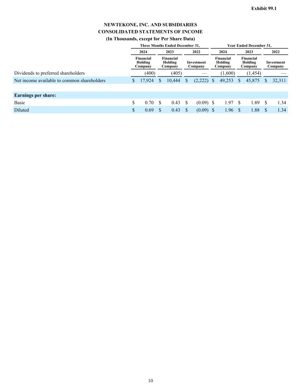 Dividends to preferred shareholders (400) (405) — (1,600) (1,454) — Net income available to common shareholders $ 17,924 $ 10,444 $ (2,222) $ 49,253 $ 45,875 $ 32,311 Earnings per share: Basic $ 0.70 $ 0.43 $ (0.09) $ 1.97 $ 1.89 $ 1.34 Diluted $ 0.69 $ 0.43 $ (0.09) $ 1.96 $ 1.88 $ 1.34 NEWTEKONE, INC. AND SUBSIDIARIES CONSOLIDATED STATEMENTS OF INCOME (In Thousands, except for Per Share Data) Three Months Ended December 31, Year Ended December 31, 2024 2023 2022 2024 2023 2022 Financial Holding Company Financial Holding Company Investment Company Financial Holding Company Financial Holding Company Investment Company Exhibit 99.1 10