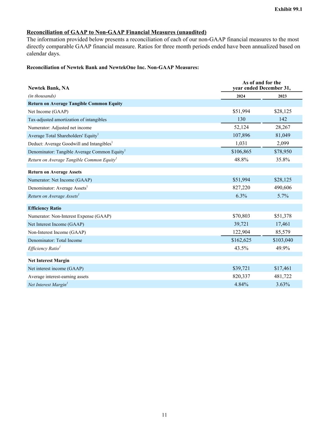 Reconciliation of GAAP to Non-GAAP Financial Measures (unaudited) The information provided below presents a reconciliation of each of our non-GAAP financial measures to the most directly comparable GAAP financial measure. Ratios for three month periods ended have been annualized based on calendar days. Reconciliation of Newtek Bank and NewtekOne Inc. Non-GAAP Measures: Newtek Bank, NA As of and for the year ended December 31, (in thousands) 2024 2023 Return on Average Tangible Common Equity Net Income (GAAP) $51,994 $28,125 Tax-adjusted amortization of intangibles 130 142 Numerator: Adjusted net income 52,124 28,267 Average Total Shareholders' Equity1 107,896 81,049 Deduct: Average Goodwill and Intangibles1 1,031 2,099 Denominator: Tangible Average Common Equity1 $106,865 $78,950 Return on Average Tangible Common Equity1 48.8% 35.8% Return on Average Assets Numerator: Net Income (GAAP) $51,994 $28,125 Denominator: Average Assets1 827,220 490,606 Return on Average Assets1 6.3% 5.7% Efficiency Ratio Numerator: Non-Interest Expense (GAAP) $70,803 $51,378 Net Interest Income (GAAP) 39,721 17,461 Non-Interest Income (GAAP) 122,904 85,579 Denominator: Total Income $162,625 $103,040 Efficiency Ratio1 43.5% 49.9% Net Interest Margin Net interest income (GAAP) $39,721 $17,461 Average interest-earning assets 820,337 481,722 Net Interest Margin1 4.84% 3.63% Exhibit 99.1 11