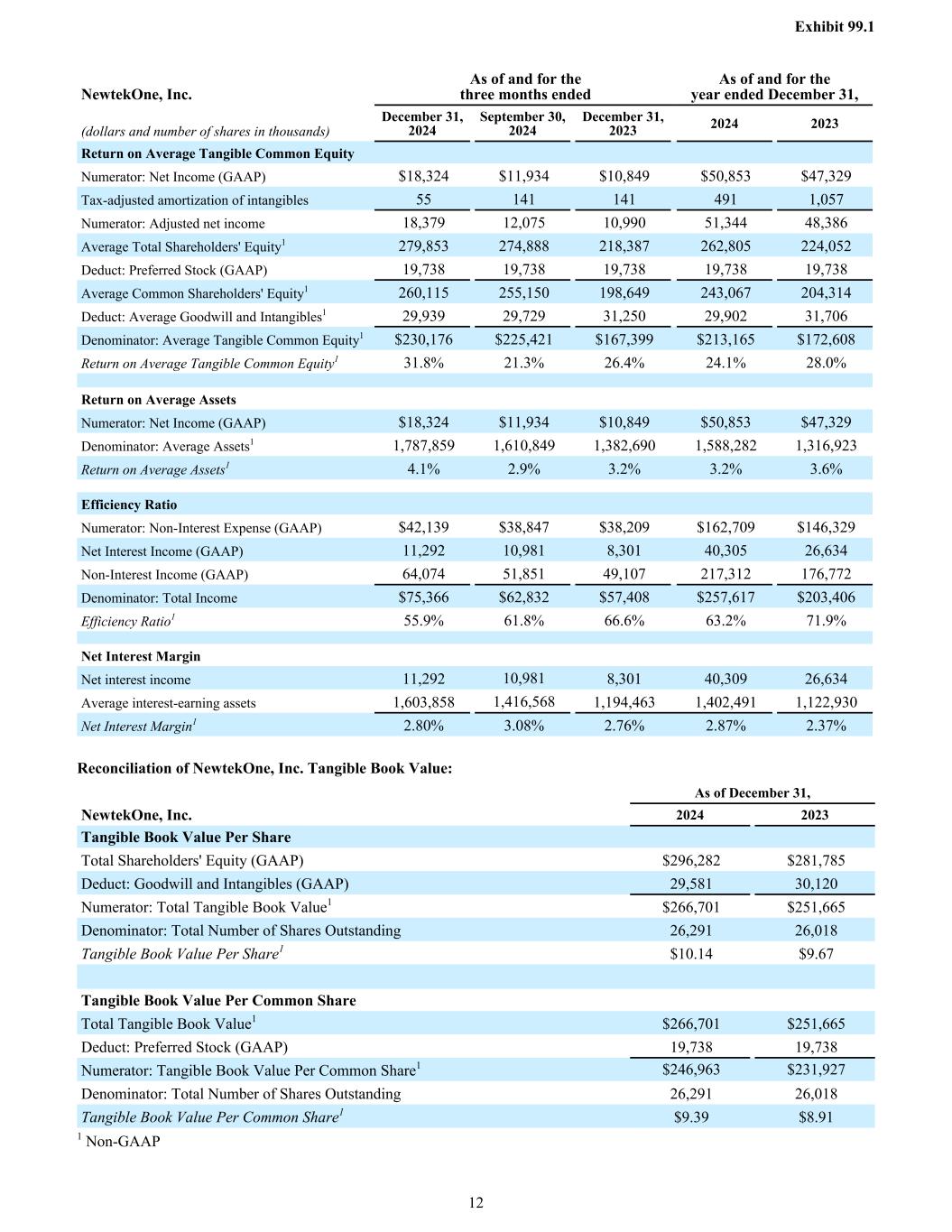 NewtekOne, Inc. As of and for the three months ended As of and for the year ended December 31, (dollars and number of shares in thousands) December 31, 2024 September 30, 2024 December 31, 2023 2024 2023 Return on Average Tangible Common Equity Numerator: Net Income (GAAP) $18,324 $11,934 $10,849 $50,853 $47,329 Tax-adjusted amortization of intangibles 55 141 141 491 1,057 Numerator: Adjusted net income 18,379 12,075 10,990 51,344 48,386 Average Total Shareholders' Equity1 279,853 274,888 218,387 262,805 224,052 Deduct: Preferred Stock (GAAP) 19,738 19,738 19,738 19,738 19,738 Average Common Shareholders' Equity1 260,115 255,150 198,649 243,067 204,314 Deduct: Average Goodwill and Intangibles1 29,939 29,729 31,250 29,902 31,706 Denominator: Average Tangible Common Equity1 $230,176 $225,421 $167,399 $213,165 $172,608 Return on Average Tangible Common Equity1 31.8% 21.3% 26.4% 24.1% 28.0% Return on Average Assets Numerator: Net Income (GAAP) $18,324 $11,934 $10,849 $50,853 $47,329 Denominator: Average Assets1 1,787,859 1,610,849 1,382,690 1,588,282 1,316,923 Return on Average Assets1 4.1% 2.9% 3.2% 3.2% 3.6% Efficiency Ratio Numerator: Non-Interest Expense (GAAP) $42,139 $38,847 $38,209 $162,709 $146,329 Net Interest Income (GAAP) 11,292 10,981 8,301 40,305 26,634 Non-Interest Income (GAAP) 64,074 51,851 49,107 217,312 176,772 Denominator: Total Income $75,366 $62,832 $57,408 $257,617 $203,406 Efficiency Ratio1 55.9% 61.8% 66.6% 63.2% 71.9% Net Interest Margin Net interest income 11,292 10,981 8,301 40,309 26,634 Average interest-earning assets 1,603,858 1,416,568 1,194,463 1,402,491 1,122,930 Net Interest Margin1 2.80% 3.08% 2.76% 2.87% 2.37% Reconciliation of NewtekOne, Inc. Tangible Book Value: As of December 31, NewtekOne, Inc. 2024 2023 Tangible Book Value Per Share Total Shareholders' Equity (GAAP) $296,282 $281,785 Deduct: Goodwill and Intangibles (GAAP) 29,581 30,120 Numerator: Total Tangible Book Value1 $266,701 $251,665 Denominator: Total Number of Shares Outstanding 26,291 26,018 Tangible Book Value Per Share1 $10.14 $9.67 Tangible Book Value Per Common Share Total Tangible Book Value1 $266,701 $251,665 Deduct: Preferred Stock (GAAP) 19,738 19,738 Numerator: Tangible Book Value Per Common Share1 $246,963 $231,927 Denominator: Total Number of Shares Outstanding 26,291 26,018 Tangible Book Value Per Common Share1 $9.39 $8.91 1 Non-GAAP Exhibit 99.1 12