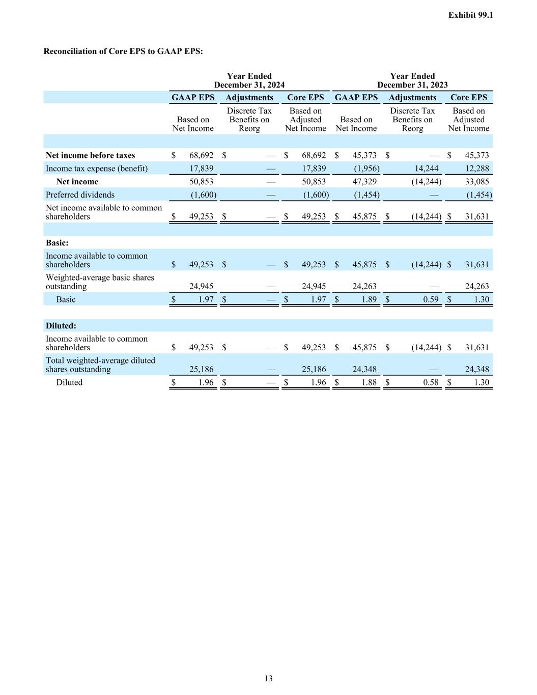 Reconciliation of Core EPS to GAAP EPS: Year Ended December 31, 2024 Year Ended December 31, 2023 GAAP EPS Adjustments Core EPS GAAP EPS Adjustments Core EPS Based on Net Income Discrete Tax Benefits on Reorg Based on Adjusted Net Income Based on Net Income Discrete Tax Benefits on Reorg Based on Adjusted Net Income Net income before taxes $ 68,692 $ — $ 68,692 $ 45,373 $ — $ 45,373 Income tax expense (benefit) 17,839 — 17,839 (1,956) 14,244 12,288 Net income 50,853 — 50,853 47,329 (14,244) 33,085 Preferred dividends (1,600) — (1,600) (1,454) — (1,454) Net income available to common shareholders $ 49,253 $ — $ 49,253 $ 45,875 $ (14,244) $ 31,631 Basic: Income available to common shareholders $ 49,253 $ — $ 49,253 $ 45,875 $ (14,244) $ 31,631 Weighted-average basic shares outstanding 24,945 — 24,945 24,263 — 24,263 Basic $ 1.97 $ — $ 1.97 $ 1.89 $ 0.59 $ 1.30 Diluted: Income available to common shareholders $ 49,253 $ — $ 49,253 $ 45,875 $ (14,244) $ 31,631 Total weighted-average diluted shares outstanding 25,186 — 25,186 24,348 — 24,348 Diluted $ 1.96 $ — $ 1.96 $ 1.88 $ 0.58 $ 1.30 Exhibit 99.1 13