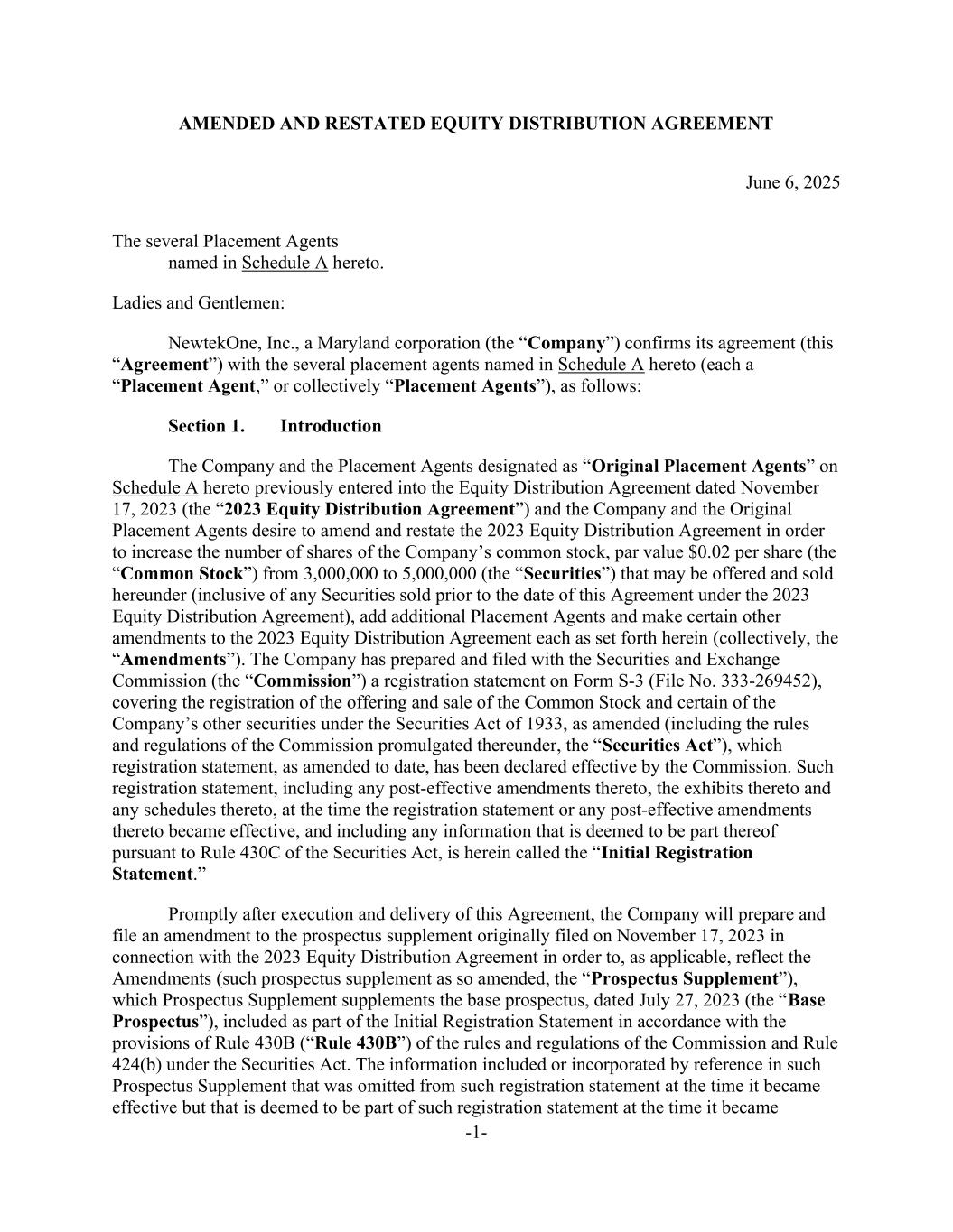 -1- AMENDED AND RESTATED EQUITY DISTRIBUTION AGREEMENT June 6, 2025 The several Placement Agents named in Schedule A hereto. Ladies and Gentlemen: NewtekOne, Inc., a Maryland corporation (the “Company”) confirms its agreement (this “Agreement”) with the several placement agents named in Schedule A hereto (each a “Placement Agent,” or collectively “Placement Agents”), as follows: Section 1. Introduction The Company and the Placement Agents designated as “Original Placement Agents” on Schedule A hereto previously entered into the Equity Distribution Agreement dated November 17, 2023 (the “2023 Equity Distribution Agreement”) and the Company and the Original Placement Agents desire to amend and restate the 2023 Equity Distribution Agreement in order to increase the number of shares of the Company’s common stock, par value $0.02 per share (the “Common Stock”) from 3,000,000 to 5,000,000 (the “Securities”) that may be offered and sold hereunder (inclusive of any Securities sold prior to the date of this Agreement under the 2023 Equity Distribution Agreement), add additional Placement Agents and make certain other amendments to the 2023 Equity Distribution Agreement each as set forth herein (collectively, the “Amendments”). The Company has prepared and filed with the Securities and Exchange Commission (the “Commission”) a registration statement on Form S-3 (File No. 333-269452), covering the registration of the offering and sale of the Common Stock and certain of the Company’s other securities under the Securities Act of 1933, as amended (including the rules and regulations of the Commission promulgated thereunder, the “Securities Act”), which registration statement, as amended to date, has been declared effective by the Commission. Such registration statement, including any post-effective amendments thereto, the exhibits thereto and any schedules thereto, at the time the registration statement or any post-effective amendments thereto became effective, and including any information that is deemed to be part thereof pursuant to Rule 430C of the Securities Act, is herein called the “Initial Registration Statement.” Promptly after execution and delivery of this Agreement, the Company will prepare and file an amendment to the prospectus supplement originally filed on November 17, 2023 in connection with the 2023 Equity Distribution Agreement in order to, as applicable, reflect the Amendments (such prospectus supplement as so amended, the “Prospectus Supplement”), which Prospectus Supplement supplements the base prospectus, dated July 27, 2023 (the “Base Prospectus”), included as part of the Initial Registration Statement in accordance with the provisions of Rule 430B (“Rule 430B”) of the rules and regulations of the Commission and Rule 424(b) under the Securities Act. The information included or incorporated by reference in such Prospectus Supplement that was omitted from such registration statement at the time it became effective but that is deemed to be part of such registration statement at the time it became