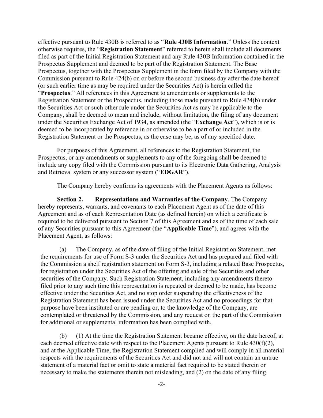 -2- effective pursuant to Rule 430B is referred to as “Rule 430B Information.” Unless the context otherwise requires, the “Registration Statement” referred to herein shall include all documents filed as part of the Initial Registration Statement and any Rule 430B Information contained in the Prospectus Supplement and deemed to be part of the Registration Statement. The Base Prospectus, together with the Prospectus Supplement in the form filed by the Company with the Commission pursuant to Rule 424(b) on or before the second business day after the date hereof (or such earlier time as may be required under the Securities Act) is herein called the “Prospectus.” All references in this Agreement to amendments or supplements to the Registration Statement or the Prospectus, including those made pursuant to Rule 424(b) under the Securities Act or such other rule under the Securities Act as may be applicable to the Company, shall be deemed to mean and include, without limitation, the filing of any document under the Securities Exchange Act of 1934, as amended (the “Exchange Act”), which is or is deemed to be incorporated by reference in or otherwise to be a part of or included in the Registration Statement or the Prospectus, as the case may be, as of any specified date. For purposes of this Agreement, all references to the Registration Statement, the Prospectus, or any amendments or supplements to any of the foregoing shall be deemed to include any copy filed with the Commission pursuant to its Electronic Data Gathering, Analysis and Retrieval system or any successor system (“EDGAR”). The Company hereby confirms its agreements with the Placement Agents as follows: Section 2. Representations and Warranties of the Company. The Company hereby represents, warrants, and covenants to each Placement Agent as of the date of this Agreement and as of each Representation Date (as defined herein) on which a certificate is required to be delivered pursuant to Section 7 of this Agreement and as of the time of each sale of any Securities pursuant to this Agreement (the “Applicable Time”), and agrees with the Placement Agent, as follows: (a) The Company, as of the date of filing of the Initial Registration Statement, met the requirements for use of Form S-3 under the Securities Act and has prepared and filed with the Commission a shelf registration statement on Form S-3, including a related Base Prospectus, for registration under the Securities Act of the offering and sale of the Securities and other securities of the Company. Such Registration Statement, including any amendments thereto filed prior to any such time this representation is repeated or deemed to be made, has become effective under the Securities Act, and no stop order suspending the effectiveness of the Registration Statement has been issued under the Securities Act and no proceedings for that purpose have been instituted or are pending or, to the knowledge of the Company, are contemplated or threatened by the Commission, and any request on the part of the Commission for additional or supplemental information has been complied with. (b) (1) At the time the Registration Statement became effective, on the date hereof, at each deemed effective date with respect to the Placement Agents pursuant to Rule 430(f)(2), and at the Applicable Time, the Registration Statement complied and will comply in all material respects with the requirements of the Securities Act and did not and will not contain an untrue statement of a material fact or omit to state a material fact required to be stated therein or necessary to make the statements therein not misleading, and (2) on the date of any filing