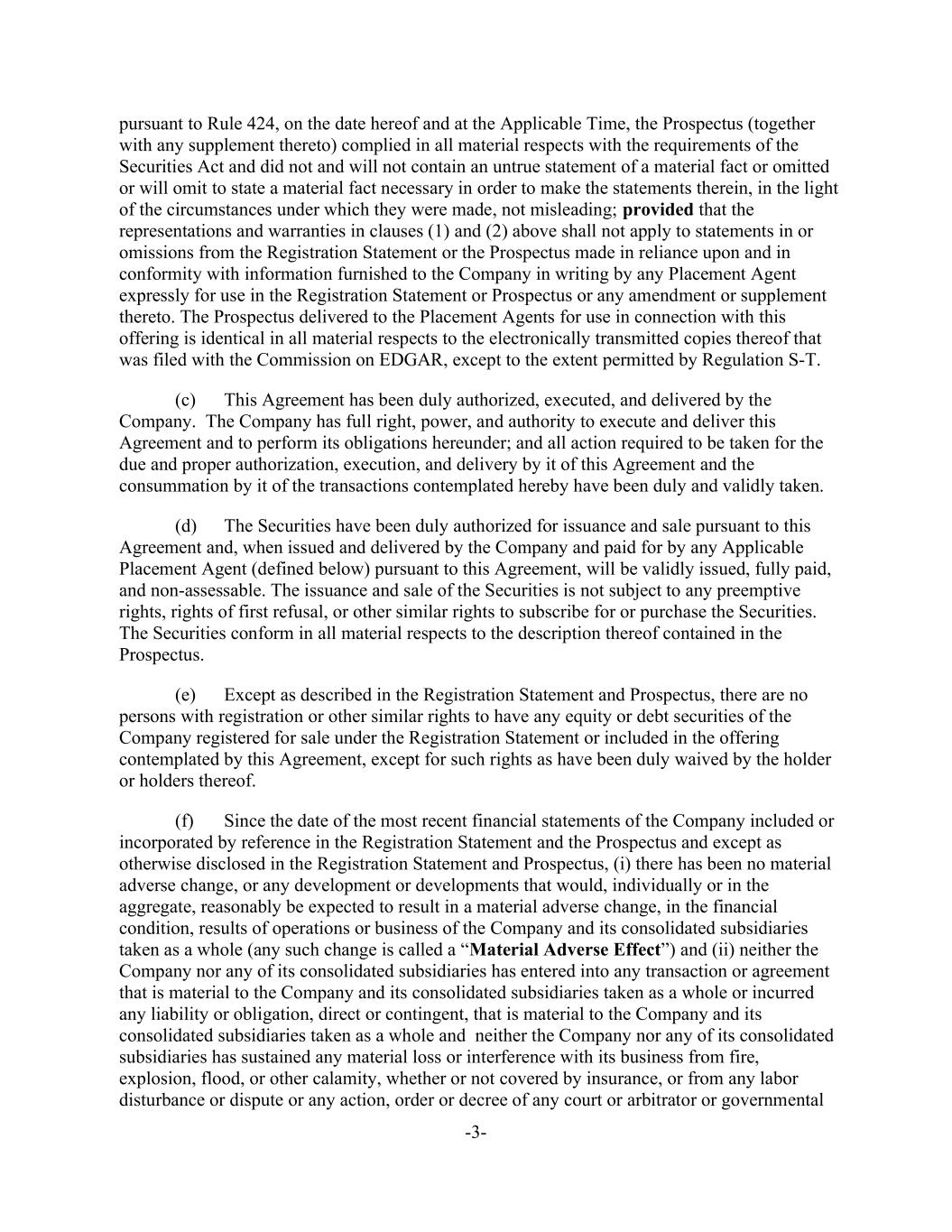 -3- pursuant to Rule 424, on the date hereof and at the Applicable Time, the Prospectus (together with any supplement thereto) complied in all material respects with the requirements of the Securities Act and did not and will not contain an untrue statement of a material fact or omitted or will omit to state a material fact necessary in order to make the statements therein, in the light of the circumstances under which they were made, not misleading; provided that the representations and warranties in clauses (1) and (2) above shall not apply to statements in or omissions from the Registration Statement or the Prospectus made in reliance upon and in conformity with information furnished to the Company in writing by any Placement Agent expressly for use in the Registration Statement or Prospectus or any amendment or supplement thereto. The Prospectus delivered to the Placement Agents for use in connection with this offering is identical in all material respects to the electronically transmitted copies thereof that was filed with the Commission on EDGAR, except to the extent permitted by Regulation S-T. (c) This Agreement has been duly authorized, executed, and delivered by the Company. The Company has full right, power, and authority to execute and deliver this Agreement and to perform its obligations hereunder; and all action required to be taken for the due and proper authorization, execution, and delivery by it of this Agreement and the consummation by it of the transactions contemplated hereby have been duly and validly taken. (d) The Securities have been duly authorized for issuance and sale pursuant to this Agreement and, when issued and delivered by the Company and paid for by any Applicable Placement Agent (defined below) pursuant to this Agreement, will be validly issued, fully paid, and non-assessable. The issuance and sale of the Securities is not subject to any preemptive rights, rights of first refusal, or other similar rights to subscribe for or purchase the Securities. The Securities conform in all material respects to the description thereof contained in the Prospectus. (e) Except as described in the Registration Statement and Prospectus, there are no persons with registration or other similar rights to have any equity or debt securities of the Company registered for sale under the Registration Statement or included in the offering contemplated by this Agreement, except for such rights as have been duly waived by the holder or holders thereof. (f) Since the date of the most recent financial statements of the Company included or incorporated by reference in the Registration Statement and the Prospectus and except as otherwise disclosed in the Registration Statement and Prospectus, (i) there has been no material adverse change, or any development or developments that would, individually or in the aggregate, reasonably be expected to result in a material adverse change, in the financial condition, results of operations or business of the Company and its consolidated subsidiaries taken as a whole (any such change is called a “Material Adverse Effect”) and (ii) neither the Company nor any of its consolidated subsidiaries has entered into any transaction or agreement that is material to the Company and its consolidated subsidiaries taken as a whole or incurred any liability or obligation, direct or contingent, that is material to the Company and its consolidated subsidiaries taken as a whole and neither the Company nor any of its consolidated subsidiaries has sustained any material loss or interference with its business from fire, explosion, flood, or other calamity, whether or not covered by insurance, or from any labor disturbance or dispute or any action, order or decree of any court or arbitrator or governmental