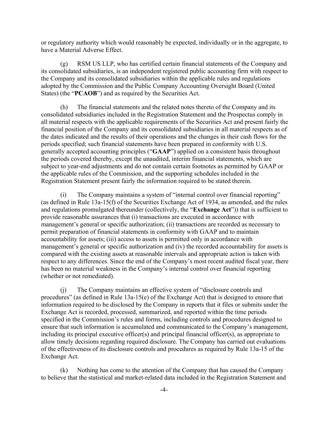 -4- or regulatory authority which would reasonably be expected, individually or in the aggregate, to have a Material Adverse Effect. (g) RSM US LLP, who has certified certain financial statements of the Company and its consolidated subsidiaries, is an independent registered public accounting firm with respect to the Company and its consolidated subsidiaries within the applicable rules and regulations adopted by the Commission and the Public Company Accounting Oversight Board (United States) (the “PCAOB”) and as required by the Securities Act. (h) The financial statements and the related notes thereto of the Company and its consolidated subsidiaries included in the Registration Statement and the Prospectus comply in all material respects with the applicable requirements of the Securities Act and present fairly the financial position of the Company and its consolidated subsidiaries in all material respects as of the dates indicated and the results of their operations and the changes in their cash flows for the periods specified; such financial statements have been prepared in conformity with U.S. generally accepted accounting principles (“GAAP”) applied on a consistent basis throughout the periods covered thereby, except the unaudited, interim financial statements, which are subject to year-end adjustments and do not contain certain footnotes as permitted by GAAP or the applicable rules of the Commission, and the supporting schedules included in the Registration Statement present fairly the information required to be stated therein. (i) The Company maintains a system of “internal control over financial reporting” (as defined in Rule 13a-15(f) of the Securities Exchange Act of 1934, as amended, and the rules and regulations promulgated thereunder (collectively, the “Exchange Act”)) that is sufficient to provide reasonable assurances that (i) transactions are executed in accordance with management’s general or specific authorization; (ii) transactions are recorded as necessary to permit preparation of financial statements in conformity with GAAP and to maintain accountability for assets; (iii) access to assets is permitted only in accordance with management’s general or specific authorization and (iv) the recorded accountability for assets is compared with the existing assets at reasonable intervals and appropriate action is taken with respect to any differences. Since the end of the Company’s most recent audited fiscal year, there has been no material weakness in the Company’s internal control over financial reporting (whether or not remediated). (j) The Company maintains an effective system of “disclosure controls and procedures” (as defined in Rule 13a-15(e) of the Exchange Act) that is designed to ensure that information required to be disclosed by the Company in reports that it files or submits under the Exchange Act is recorded, processed, summarized, and reported within the time periods specified in the Commission’s rules and forms, including controls and procedures designed to ensure that such information is accumulated and communicated to the Company’s management, including its principal executive officer(s) and principal financial officer(s), as appropriate to allow timely decisions regarding required disclosure. The Company has carried out evaluations of the effectiveness of its disclosure controls and procedures as required by Rule 13a-15 of the Exchange Act. (k) Nothing has come to the attention of the Company that has caused the Company to believe that the statistical and market-related data included in the Registration Statement and