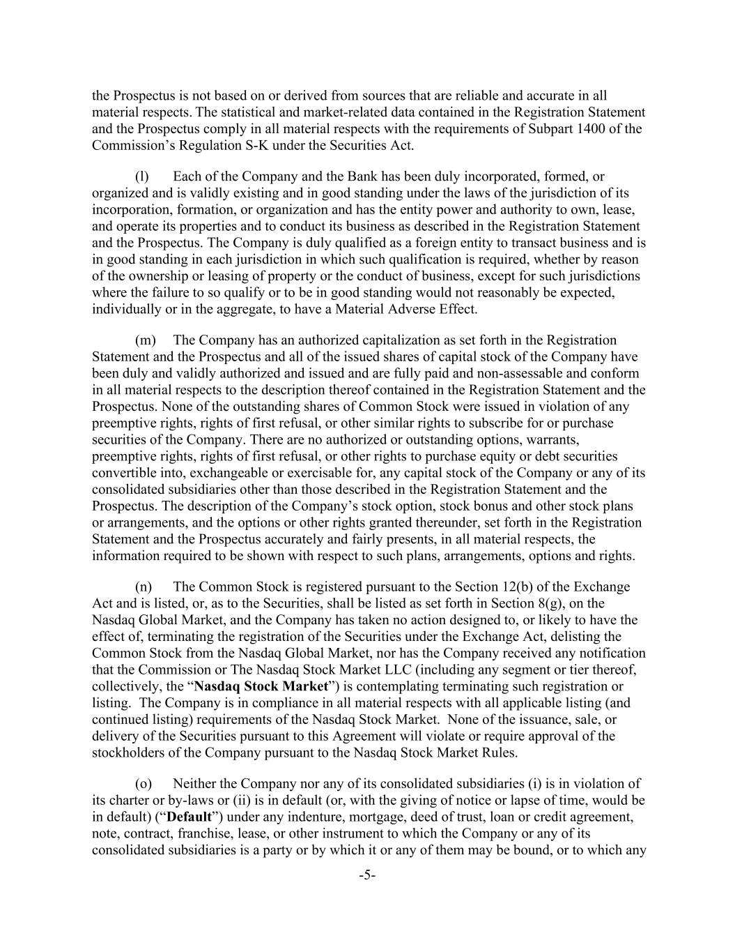 -5- the Prospectus is not based on or derived from sources that are reliable and accurate in all material respects. The statistical and market-related data contained in the Registration Statement and the Prospectus comply in all material respects with the requirements of Subpart 1400 of the Commission’s Regulation S-K under the Securities Act. (l) Each of the Company and the Bank has been duly incorporated, formed, or organized and is validly existing and in good standing under the laws of the jurisdiction of its incorporation, formation, or organization and has the entity power and authority to own, lease, and operate its properties and to conduct its business as described in the Registration Statement and the Prospectus. The Company is duly qualified as a foreign entity to transact business and is in good standing in each jurisdiction in which such qualification is required, whether by reason of the ownership or leasing of property or the conduct of business, except for such jurisdictions where the failure to so qualify or to be in good standing would not reasonably be expected, individually or in the aggregate, to have a Material Adverse Effect. (m) The Company has an authorized capitalization as set forth in the Registration Statement and the Prospectus and all of the issued shares of capital stock of the Company have been duly and validly authorized and issued and are fully paid and non-assessable and conform in all material respects to the description thereof contained in the Registration Statement and the Prospectus. None of the outstanding shares of Common Stock were issued in violation of any preemptive rights, rights of first refusal, or other similar rights to subscribe for or purchase securities of the Company. There are no authorized or outstanding options, warrants, preemptive rights, rights of first refusal, or other rights to purchase equity or debt securities convertible into, exchangeable or exercisable for, any capital stock of the Company or any of its consolidated subsidiaries other than those described in the Registration Statement and the Prospectus. The description of the Company’s stock option, stock bonus and other stock plans or arrangements, and the options or other rights granted thereunder, set forth in the Registration Statement and the Prospectus accurately and fairly presents, in all material respects, the information required to be shown with respect to such plans, arrangements, options and rights. (n) The Common Stock is registered pursuant to the Section 12(b) of the Exchange Act and is listed, or, as to the Securities, shall be listed as set forth in Section 8(g), on the Nasdaq Global Market, and the Company has taken no action designed to, or likely to have the effect of, terminating the registration of the Securities under the Exchange Act, delisting the Common Stock from the Nasdaq Global Market, nor has the Company received any notification that the Commission or The Nasdaq Stock Market LLC (including any segment or tier thereof, collectively, the “Nasdaq Stock Market”) is contemplating terminating such registration or listing. The Company is in compliance in all material respects with all applicable listing (and continued listing) requirements of the Nasdaq Stock Market. None of the issuance, sale, or delivery of the Securities pursuant to this Agreement will violate or require approval of the stockholders of the Company pursuant to the Nasdaq Stock Market Rules. (o) Neither the Company nor any of its consolidated subsidiaries (i) is in violation of its charter or by-laws or (ii) is in default (or, with the giving of notice or lapse of time, would be in default) (“Default”) under any indenture, mortgage, deed of trust, loan or credit agreement, note, contract, franchise, lease, or other instrument to which the Company or any of its consolidated subsidiaries is a party or by which it or any of them may be bound, or to which any