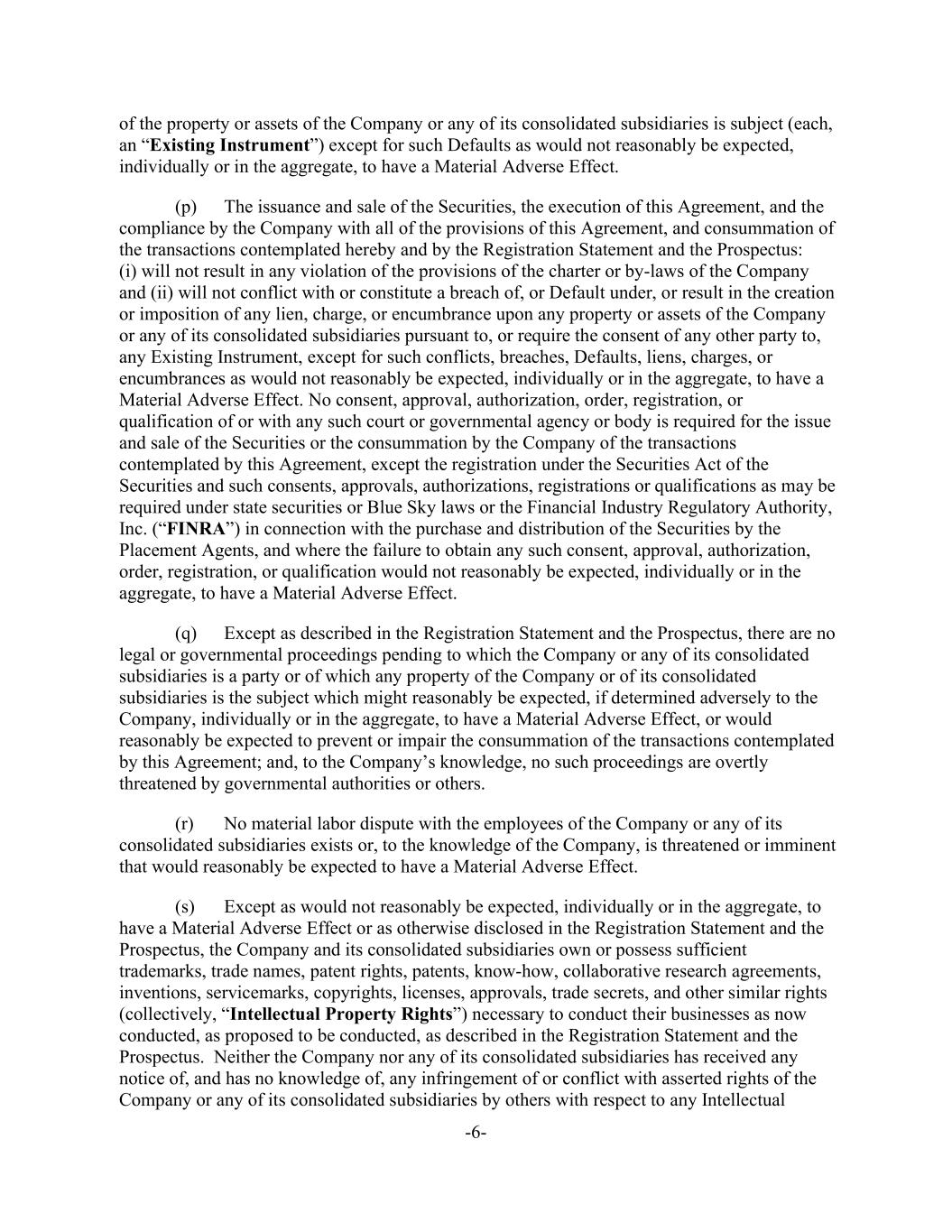 -6- of the property or assets of the Company or any of its consolidated subsidiaries is subject (each, an “Existing Instrument”) except for such Defaults as would not reasonably be expected, individually or in the aggregate, to have a Material Adverse Effect. (p) The issuance and sale of the Securities, the execution of this Agreement, and the compliance by the Company with all of the provisions of this Agreement, and consummation of the transactions contemplated hereby and by the Registration Statement and the Prospectus: (i) will not result in any violation of the provisions of the charter or by-laws of the Company and (ii) will not conflict with or constitute a breach of, or Default under, or result in the creation or imposition of any lien, charge, or encumbrance upon any property or assets of the Company or any of its consolidated subsidiaries pursuant to, or require the consent of any other party to, any Existing Instrument, except for such conflicts, breaches, Defaults, liens, charges, or encumbrances as would not reasonably be expected, individually or in the aggregate, to have a Material Adverse Effect. No consent, approval, authorization, order, registration, or qualification of or with any such court or governmental agency or body is required for the issue and sale of the Securities or the consummation by the Company of the transactions contemplated by this Agreement, except the registration under the Securities Act of the Securities and such consents, approvals, authorizations, registrations or qualifications as may be required under state securities or Blue Sky laws or the Financial Industry Regulatory Authority, Inc. (“FINRA”) in connection with the purchase and distribution of the Securities by the Placement Agents, and where the failure to obtain any such consent, approval, authorization, order, registration, or qualification would not reasonably be expected, individually or in the aggregate, to have a Material Adverse Effect. (q) Except as described in the Registration Statement and the Prospectus, there are no legal or governmental proceedings pending to which the Company or any of its consolidated subsidiaries is a party or of which any property of the Company or of its consolidated subsidiaries is the subject which might reasonably be expected, if determined adversely to the Company, individually or in the aggregate, to have a Material Adverse Effect, or would reasonably be expected to prevent or impair the consummation of the transactions contemplated by this Agreement; and, to the Company’s knowledge, no such proceedings are overtly threatened by governmental authorities or others. (r) No material labor dispute with the employees of the Company or any of its consolidated subsidiaries exists or, to the knowledge of the Company, is threatened or imminent that would reasonably be expected to have a Material Adverse Effect. (s) Except as would not reasonably be expected, individually or in the aggregate, to have a Material Adverse Effect or as otherwise disclosed in the Registration Statement and the Prospectus, the Company and its consolidated subsidiaries own or possess sufficient trademarks, trade names, patent rights, patents, know-how, collaborative research agreements, inventions, servicemarks, copyrights, licenses, approvals, trade secrets, and other similar rights (collectively, “Intellectual Property Rights”) necessary to conduct their businesses as now conducted, as proposed to be conducted, as described in the Registration Statement and the Prospectus. Neither the Company nor any of its consolidated subsidiaries has received any notice of, and has no knowledge of, any infringement of or conflict with asserted rights of the Company or any of its consolidated subsidiaries by others with respect to any Intellectual