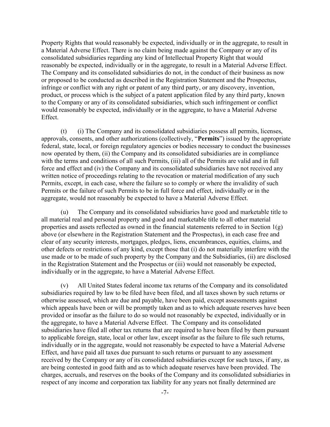 -7- Property Rights that would reasonably be expected, individually or in the aggregate, to result in a Material Adverse Effect. There is no claim being made against the Company or any of its consolidated subsidiaries regarding any kind of Intellectual Property Right that would reasonably be expected, individually or in the aggregate, to result in a Material Adverse Effect. The Company and its consolidated subsidiaries do not, in the conduct of their business as now or proposed to be conducted as described in the Registration Statement and the Prospectus, infringe or conflict with any right or patent of any third party, or any discovery, invention, product, or process which is the subject of a patent application filed by any third party, known to the Company or any of its consolidated subsidiaries, which such infringement or conflict would reasonably be expected, individually or in the aggregate, to have a Material Adverse Effect. (t) (i) The Company and its consolidated subsidiaries possess all permits, licenses, approvals, consents, and other authorizations (collectively, “Permits”) issued by the appropriate federal, state, local, or foreign regulatory agencies or bodies necessary to conduct the businesses now operated by them, (ii) the Company and its consolidated subsidiaries are in compliance with the terms and conditions of all such Permits, (iii) all of the Permits are valid and in full force and effect and (iv) the Company and its consolidated subsidiaries have not received any written notice of proceedings relating to the revocation or material modification of any such Permits, except, in each case, where the failure so to comply or where the invalidity of such Permits or the failure of such Permits to be in full force and effect, individually or in the aggregate, would not reasonably be expected to have a Material Adverse Effect. (u) The Company and its consolidated subsidiaries have good and marketable title to all material real and personal property and good and marketable title to all other material properties and assets reflected as owned in the financial statements referred to in Section 1(g) above (or elsewhere in the Registration Statement and the Prospectus), in each case free and clear of any security interests, mortgages, pledges, liens, encumbrances, equities, claims, and other defects or restrictions of any kind, except those that (i) do not materially interfere with the use made or to be made of such property by the Company and the Subsidiaries, (ii) are disclosed in the Registration Statement and the Prospectus or (iii) would not reasonably be expected, individually or in the aggregate, to have a Material Adverse Effect. (v) All United States federal income tax returns of the Company and its consolidated subsidiaries required by law to be filed have been filed, and all taxes shown by such returns or otherwise assessed, which are due and payable, have been paid, except assessments against which appeals have been or will be promptly taken and as to which adequate reserves have been provided or insofar as the failure to do so would not reasonably be expected, individually or in the aggregate, to have a Material Adverse Effect. The Company and its consolidated subsidiaries have filed all other tax returns that are required to have been filed by them pursuant to applicable foreign, state, local or other law, except insofar as the failure to file such returns, individually or in the aggregate, would not reasonably be expected to have a Material Adverse Effect, and have paid all taxes due pursuant to such returns or pursuant to any assessment received by the Company or any of its consolidated subsidiaries except for such taxes, if any, as are being contested in good faith and as to which adequate reserves have been provided. The charges, accruals, and reserves on the books of the Company and its consolidated subsidiaries in respect of any income and corporation tax liability for any years not finally determined are