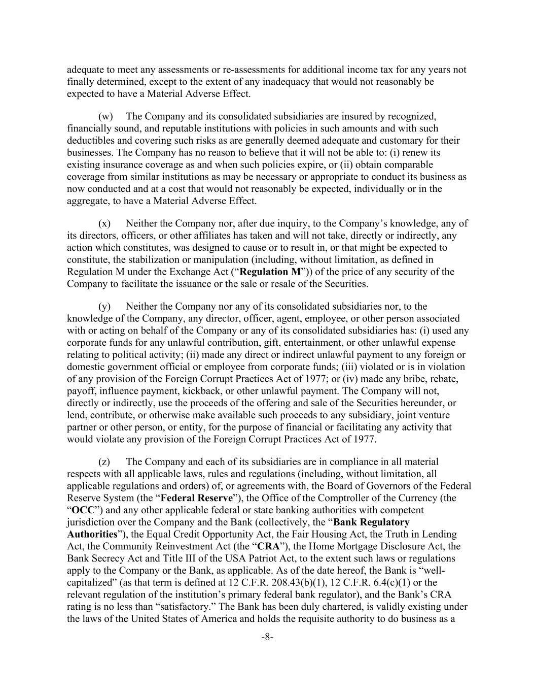 -8- adequate to meet any assessments or re-assessments for additional income tax for any years not finally determined, except to the extent of any inadequacy that would not reasonably be expected to have a Material Adverse Effect. (w) The Company and its consolidated subsidiaries are insured by recognized, financially sound, and reputable institutions with policies in such amounts and with such deductibles and covering such risks as are generally deemed adequate and customary for their businesses. The Company has no reason to believe that it will not be able to: (i) renew its existing insurance coverage as and when such policies expire, or (ii) obtain comparable coverage from similar institutions as may be necessary or appropriate to conduct its business as now conducted and at a cost that would not reasonably be expected, individually or in the aggregate, to have a Material Adverse Effect. (x) Neither the Company nor, after due inquiry, to the Company’s knowledge, any of its directors, officers, or other affiliates has taken and will not take, directly or indirectly, any action which constitutes, was designed to cause or to result in, or that might be expected to constitute, the stabilization or manipulation (including, without limitation, as defined in Regulation M under the Exchange Act (“Regulation M”)) of the price of any security of the Company to facilitate the issuance or the sale or resale of the Securities. (y) Neither the Company nor any of its consolidated subsidiaries nor, to the knowledge of the Company, any director, officer, agent, employee, or other person associated with or acting on behalf of the Company or any of its consolidated subsidiaries has: (i) used any corporate funds for any unlawful contribution, gift, entertainment, or other unlawful expense relating to political activity; (ii) made any direct or indirect unlawful payment to any foreign or domestic government official or employee from corporate funds; (iii) violated or is in violation of any provision of the Foreign Corrupt Practices Act of 1977; or (iv) made any bribe, rebate, payoff, influence payment, kickback, or other unlawful payment. The Company will not, directly or indirectly, use the proceeds of the offering and sale of the Securities hereunder, or lend, contribute, or otherwise make available such proceeds to any subsidiary, joint venture partner or other person, or entity, for the purpose of financial or facilitating any activity that would violate any provision of the Foreign Corrupt Practices Act of 1977. (z) The Company and each of its subsidiaries are in compliance in all material respects with all applicable laws, rules and regulations (including, without limitation, all applicable regulations and orders) of, or agreements with, the Board of Governors of the Federal Reserve System (the “Federal Reserve”), the Office of the Comptroller of the Currency (the “OCC”) and any other applicable federal or state banking authorities with competent jurisdiction over the Company and the Bank (collectively, the “Bank Regulatory Authorities”), the Equal Credit Opportunity Act, the Fair Housing Act, the Truth in Lending Act, the Community Reinvestment Act (the “CRA”), the Home Mortgage Disclosure Act, the Bank Secrecy Act and Title III of the USA Patriot Act, to the extent such laws or regulations apply to the Company or the Bank, as applicable. As of the date hereof, the Bank is “well- capitalized” (as that term is defined at 12 C.F.R. 208.43(b)(1), 12 C.F.R. 6.4(c)(1) or the relevant regulation of the institution’s primary federal bank regulator), and the Bank’s CRA rating is no less than “satisfactory.” The Bank has been duly chartered, is validly existing under the laws of the United States of America and holds the requisite authority to do business as a