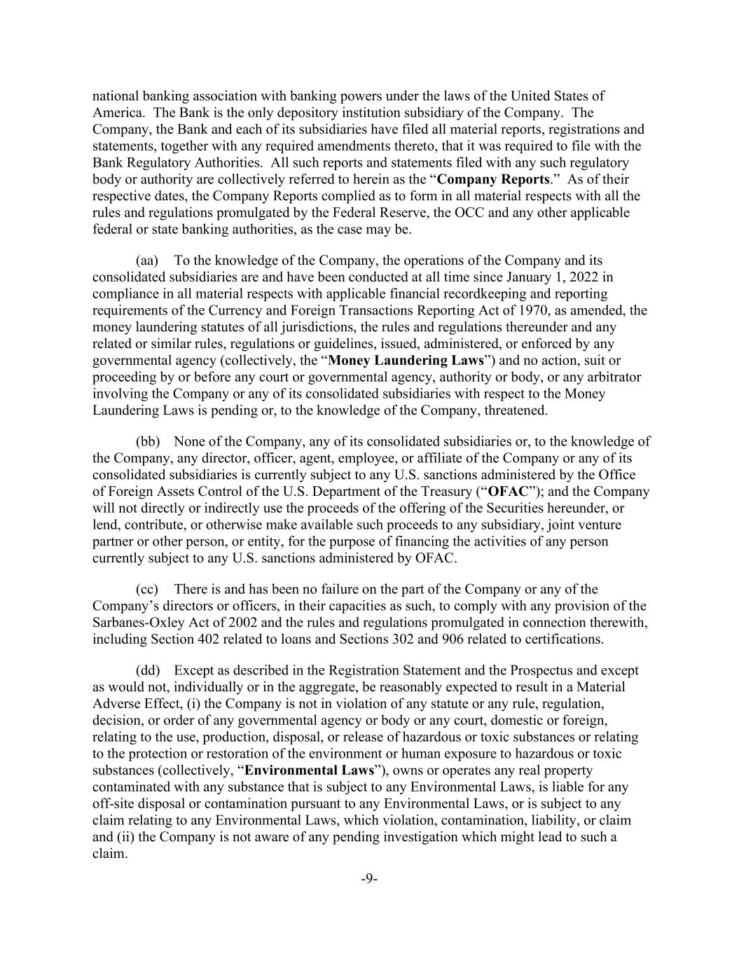 -9- national banking association with banking powers under the laws of the United States of America. The Bank is the only depository institution subsidiary of the Company. The Company, the Bank and each of its subsidiaries have filed all material reports, registrations and statements, together with any required amendments thereto, that it was required to file with the Bank Regulatory Authorities. All such reports and statements filed with any such regulatory body or authority are collectively referred to herein as the “Company Reports.” As of their respective dates, the Company Reports complied as to form in all material respects with all the rules and regulations promulgated by the Federal Reserve, the OCC and any other applicable federal or state banking authorities, as the case may be. (aa) To the knowledge of the Company, the operations of the Company and its consolidated subsidiaries are and have been conducted at all time since January 1, 2022 in compliance in all material respects with applicable financial recordkeeping and reporting requirements of the Currency and Foreign Transactions Reporting Act of 1970, as amended, the money laundering statutes of all jurisdictions, the rules and regulations thereunder and any related or similar rules, regulations or guidelines, issued, administered, or enforced by any governmental agency (collectively, the “Money Laundering Laws”) and no action, suit or proceeding by or before any court or governmental agency, authority or body, or any arbitrator involving the Company or any of its consolidated subsidiaries with respect to the Money Laundering Laws is pending or, to the knowledge of the Company, threatened. (bb) None of the Company, any of its consolidated subsidiaries or, to the knowledge of the Company, any director, officer, agent, employee, or affiliate of the Company or any of its consolidated subsidiaries is currently subject to any U.S. sanctions administered by the Office of Foreign Assets Control of the U.S. Department of the Treasury (“OFAC”); and the Company will not directly or indirectly use the proceeds of the offering of the Securities hereunder, or lend, contribute, or otherwise make available such proceeds to any subsidiary, joint venture partner or other person, or entity, for the purpose of financing the activities of any person currently subject to any U.S. sanctions administered by OFAC. (cc) There is and has been no failure on the part of the Company or any of the Company’s directors or officers, in their capacities as such, to comply with any provision of the Sarbanes-Oxley Act of 2002 and the rules and regulations promulgated in connection therewith, including Section 402 related to loans and Sections 302 and 906 related to certifications. (dd) Except as described in the Registration Statement and the Prospectus and except as would not, individually or in the aggregate, be reasonably expected to result in a Material Adverse Effect, (i) the Company is not in violation of any statute or any rule, regulation, decision, or order of any governmental agency or body or any court, domestic or foreign, relating to the use, production, disposal, or release of hazardous or toxic substances or relating to the protection or restoration of the environment or human exposure to hazardous or toxic substances (collectively, “Environmental Laws”), owns or operates any real property contaminated with any substance that is subject to any Environmental Laws, is liable for any off-site disposal or contamination pursuant to any Environmental Laws, or is subject to any claim relating to any Environmental Laws, which violation, contamination, liability, or claim and (ii) the Company is not aware of any pending investigation which might lead to such a claim.