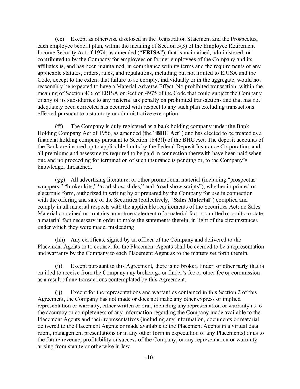-10- (ee) Except as otherwise disclosed in the Registration Statement and the Prospectus, each employee benefit plan, within the meaning of Section 3(3) of the Employee Retirement Income Security Act of 1974, as amended (“ERISA”), that is maintained, administered, or contributed to by the Company for employees or former employees of the Company and its affiliates is, and has been maintained, in compliance with its terms and the requirements of any applicable statutes, orders, rules, and regulations, including but not limited to ERISA and the Code, except to the extent that failure to so comply, individually or in the aggregate, would not reasonably be expected to have a Material Adverse Effect. No prohibited transaction, within the meaning of Section 406 of ERISA or Section 4975 of the Code that could subject the Company or any of its subsidiaries to any material tax penalty on prohibited transactions and that has not adequately been corrected has occurred with respect to any such plan excluding transactions effected pursuant to a statutory or administrative exemption. (ff) The Company is duly registered as a bank holding company under the Bank Holding Company Act of 1956, as amended (the “BHC Act”) and has elected to be treated as a financial holding company pursuant to Section 1843(l) of the BHC Act. The deposit accounts of the Bank are insured up to applicable limits by the Federal Deposit Insurance Corporation, and all premiums and assessments required to be paid in connection therewith have been paid when due and no proceeding for termination of such insurance is pending or, to the Company’s knowledge, threatened. (gg) All advertising literature, or other promotional material (including “prospectus wrappers,” “broker kits,” “road show slides,” and “road show scripts”), whether in printed or electronic form, authorized in writing by or prepared by the Company for use in connection with the offering and sale of the Securities (collectively, “Sales Material”) complied and comply in all material respects with the applicable requirements of the Securities Act; no Sales Material contained or contains an untrue statement of a material fact or omitted or omits to state a material fact necessary in order to make the statements therein, in light of the circumstances under which they were made, misleading. (hh) Any certificate signed by an officer of the Company and delivered to the Placement Agents or to counsel for the Placement Agents shall be deemed to be a representation and warranty by the Company to each Placement Agent as to the matters set forth therein. (ii) Except pursuant to this Agreement, there is no broker, finder, or other party that is entitled to receive from the Company any brokerage or finder’s fee or other fee or commission as a result of any transactions contemplated by this Agreement. (jj) Except for the representations and warranties contained in this Section 2 of this Agreement, the Company has not made or does not make any other express or implied representation or warranty, either written or oral, including any representation or warranty as to the accuracy or completeness of any information regarding the Company made available to the Placement Agents and their representatives (including any information, documents or material delivered to the Placement Agents or made available to the Placement Agents in a virtual data room, management presentations or in any other form in expectation of any Placements) or as to the future revenue, profitability or success of the Company, or any representation or warranty arising from statute or otherwise in law.