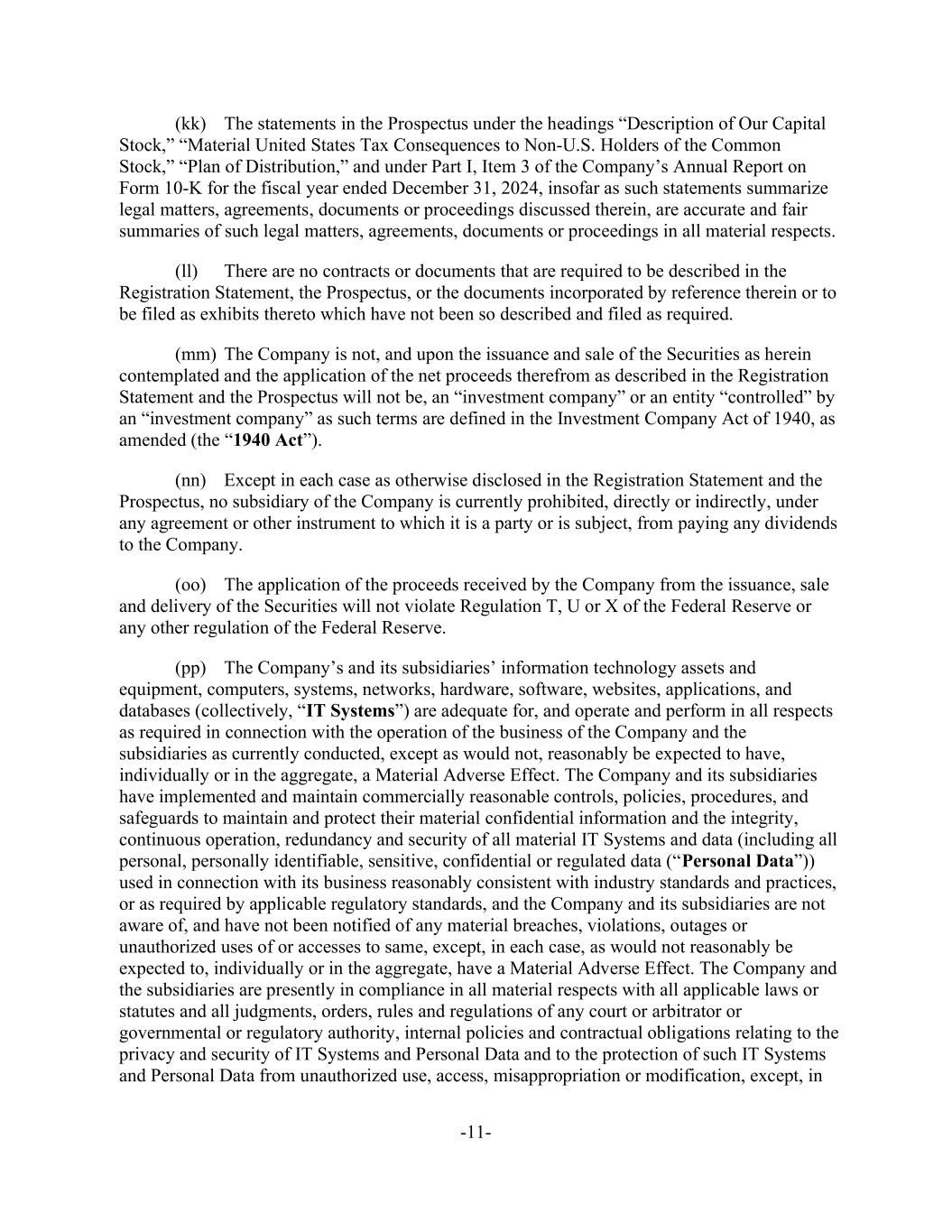 -11- (kk) The statements in the Prospectus under the headings “Description of Our Capital Stock,” “Material United States Tax Consequences to Non-U.S. Holders of the Common Stock,” “Plan of Distribution,” and under Part I, Item 3 of the Company’s Annual Report on Form 10-K for the fiscal year ended December 31, 2024, insofar as such statements summarize legal matters, agreements, documents or proceedings discussed therein, are accurate and fair summaries of such legal matters, agreements, documents or proceedings in all material respects. (ll) There are no contracts or documents that are required to be described in the Registration Statement, the Prospectus, or the documents incorporated by reference therein or to be filed as exhibits thereto which have not been so described and filed as required. (mm) The Company is not, and upon the issuance and sale of the Securities as herein contemplated and the application of the net proceeds therefrom as described in the Registration Statement and the Prospectus will not be, an “investment company” or an entity “controlled” by an “investment company” as such terms are defined in the Investment Company Act of 1940, as amended (the “1940 Act”). (nn) Except in each case as otherwise disclosed in the Registration Statement and the Prospectus, no subsidiary of the Company is currently prohibited, directly or indirectly, under any agreement or other instrument to which it is a party or is subject, from paying any dividends to the Company. (oo) The application of the proceeds received by the Company from the issuance, sale and delivery of the Securities will not violate Regulation T, U or X of the Federal Reserve or any other regulation of the Federal Reserve. (pp) The Company’s and its subsidiaries’ information technology assets and equipment, computers, systems, networks, hardware, software, websites, applications, and databases (collectively, “IT Systems”) are adequate for, and operate and perform in all respects as required in connection with the operation of the business of the Company and the subsidiaries as currently conducted, except as would not, reasonably be expected to have, individually or in the aggregate, a Material Adverse Effect. The Company and its subsidiaries have implemented and maintain commercially reasonable controls, policies, procedures, and safeguards to maintain and protect their material confidential information and the integrity, continuous operation, redundancy and security of all material IT Systems and data (including all personal, personally identifiable, sensitive, confidential or regulated data (“Personal Data”)) used in connection with its business reasonably consistent with industry standards and practices, or as required by applicable regulatory standards, and the Company and its subsidiaries are not aware of, and have not been notified of any material breaches, violations, outages or unauthorized uses of or accesses to same, except, in each case, as would not reasonably be expected to, individually or in the aggregate, have a Material Adverse Effect. The Company and the subsidiaries are presently in compliance in all material respects with all applicable laws or statutes and all judgments, orders, rules and regulations of any court or arbitrator or governmental or regulatory authority, internal policies and contractual obligations relating to the privacy and security of IT Systems and Personal Data and to the protection of such IT Systems and Personal Data from unauthorized use, access, misappropriation or modification, except, in