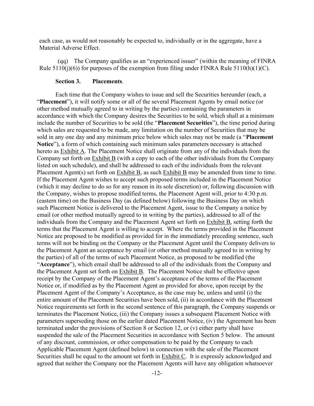 -12- each case, as would not reasonably be expected to, individually or in the aggregate, have a Material Adverse Effect. (qq) The Company qualifies as an “experienced issuer” (within the meaning of FINRA Rule 5110(j)(6)) for purposes of the exemption from filing under FINRA Rule 5110(h)(1)(C). Section 3. Placements. Each time that the Company wishes to issue and sell the Securities hereunder (each, a “Placement”), it will notify some or all of the several Placement Agents by email notice (or other method mutually agreed to in writing by the parties) containing the parameters in accordance with which the Company desires the Securities to be sold, which shall at a minimum include the number of Securities to be sold (the “Placement Securities”), the time period during which sales are requested to be made, any limitation on the number of Securities that may be sold in any one day and any minimum price below which sales may not be made (a “Placement Notice”), a form of which containing such minimum sales parameters necessary is attached hereto as Exhibit A. The Placement Notice shall originate from any of the individuals from the Company set forth on Exhibit B (with a copy to each of the other individuals from the Company listed on such schedule), and shall be addressed to each of the individuals from the relevant Placement Agent(s) set forth on Exhibit B, as such Exhibit B may be amended from time to time. If the Placement Agent wishes to accept such proposed terms included in the Placement Notice (which it may decline to do so for any reason in its sole discretion) or, following discussion with the Company, wishes to propose modified terms, the Placement Agent will, prior to 4:30 p.m. (eastern time) on the Business Day (as defined below) following the Business Day on which such Placement Notice is delivered to the Placement Agent, issue to the Company a notice by email (or other method mutually agreed to in writing by the parties), addressed to all of the individuals from the Company and the Placement Agent set forth on Exhibit B, setting forth the terms that the Placement Agent is willing to accept. Where the terms provided in the Placement Notice are proposed to be modified as provided for in the immediately preceding sentence, such terms will not be binding on the Company or the Placement Agent until the Company delivers to the Placement Agent an acceptance by email (or other method mutually agreed to in writing by the parties) of all of the terms of such Placement Notice, as proposed to be modified (the “Acceptance”), which email shall be addressed to all of the individuals from the Company and the Placement Agent set forth on Exhibit B. The Placement Notice shall be effective upon receipt by the Company of the Placement Agent’s acceptance of the terms of the Placement Notice or, if modified as by the Placement Agent as provided for above, upon receipt by the Placement Agent of the Company’s Acceptance, as the case may be, unless and until (i) the entire amount of the Placement Securities have been sold, (ii) in accordance with the Placement Notice requirements set forth in the second sentence of this paragraph, the Company suspends or terminates the Placement Notice, (iii) the Company issues a subsequent Placement Notice with parameters superseding those on the earlier dated Placement Notice, (iv) the Agreement has been terminated under the provisions of Section 8 or Section 12, or (v) either party shall have suspended the sale of the Placement Securities in accordance with Section 5 below. The amount of any discount, commission, or other compensation to be paid by the Company to each Applicable Placement Agent (defined below) in connection with the sale of the Placement Securities shall be equal to the amount set forth in Exhibit C. It is expressly acknowledged and agreed that neither the Company nor the Placement Agents will have any obligation whatsoever