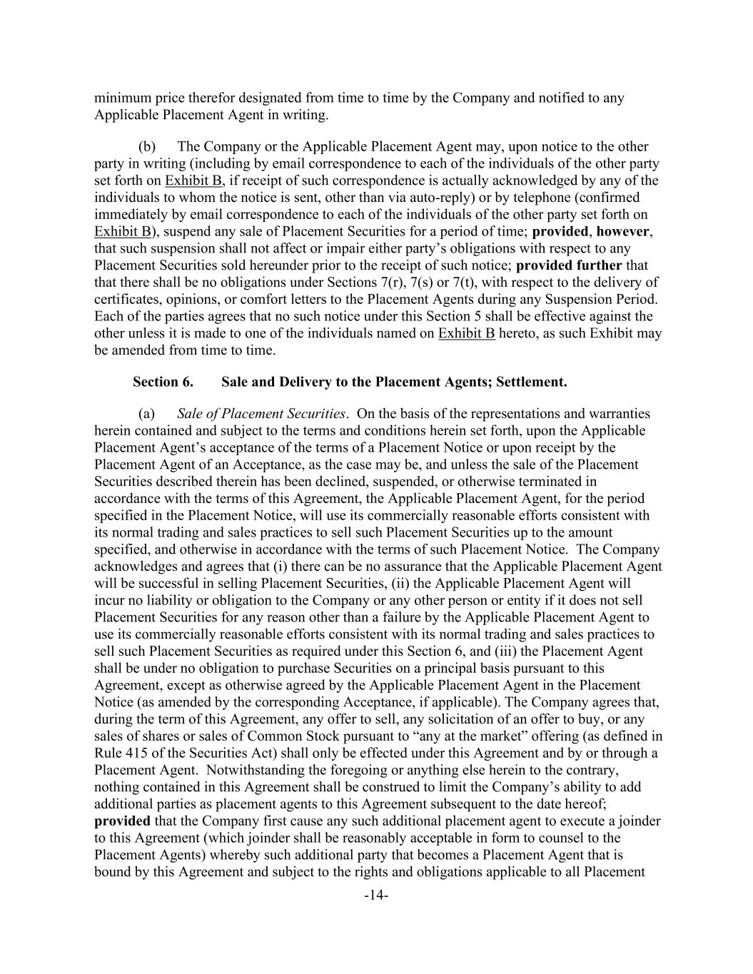 -14- minimum price therefor designated from time to time by the Company and notified to any Applicable Placement Agent in writing. (b) The Company or the Applicable Placement Agent may, upon notice to the other party in writing (including by email correspondence to each of the individuals of the other party set forth on Exhibit B, if receipt of such correspondence is actually acknowledged by any of the individuals to whom the notice is sent, other than via auto-reply) or by telephone (confirmed immediately by email correspondence to each of the individuals of the other party set forth on Exhibit B), suspend any sale of Placement Securities for a period of time; provided, however, that such suspension shall not affect or impair either party’s obligations with respect to any Placement Securities sold hereunder prior to the receipt of such notice; provided further that that there shall be no obligations under Sections 7(r), 7(s) or 7(t), with respect to the delivery of certificates, opinions, or comfort letters to the Placement Agents during any Suspension Period. Each of the parties agrees that no such notice under this Section 5 shall be effective against the other unless it is made to one of the individuals named on Exhibit B hereto, as such Exhibit may be amended from time to time. Section 6. Sale and Delivery to the Placement Agents; Settlement. (a) Sale of Placement Securities. On the basis of the representations and warranties herein contained and subject to the terms and conditions herein set forth, upon the Applicable Placement Agent’s acceptance of the terms of a Placement Notice or upon receipt by the Placement Agent of an Acceptance, as the case may be, and unless the sale of the Placement Securities described therein has been declined, suspended, or otherwise terminated in accordance with the terms of this Agreement, the Applicable Placement Agent, for the period specified in the Placement Notice, will use its commercially reasonable efforts consistent with its normal trading and sales practices to sell such Placement Securities up to the amount specified, and otherwise in accordance with the terms of such Placement Notice. The Company acknowledges and agrees that (i) there can be no assurance that the Applicable Placement Agent will be successful in selling Placement Securities, (ii) the Applicable Placement Agent will incur no liability or obligation to the Company or any other person or entity if it does not sell Placement Securities for any reason other than a failure by the Applicable Placement Agent to use its commercially reasonable efforts consistent with its normal trading and sales practices to sell such Placement Securities as required under this Section 6, and (iii) the Placement Agent shall be under no obligation to purchase Securities on a principal basis pursuant to this Agreement, except as otherwise agreed by the Applicable Placement Agent in the Placement Notice (as amended by the corresponding Acceptance, if applicable). The Company agrees that, during the term of this Agreement, any offer to sell, any solicitation of an offer to buy, or any sales of shares or sales of Common Stock pursuant to “any at the market” offering (as defined in Rule 415 of the Securities Act) shall only be effected under this Agreement and by or through a Placement Agent. Notwithstanding the foregoing or anything else herein to the contrary, nothing contained in this Agreement shall be construed to limit the Company’s ability to add additional parties as placement agents to this Agreement subsequent to the date hereof; provided that the Company first cause any such additional placement agent to execute a joinder to this Agreement (which joinder shall be reasonably acceptable in form to counsel to the Placement Agents) whereby such additional party that becomes a Placement Agent that is bound by this Agreement and subject to the rights and obligations applicable to all Placement