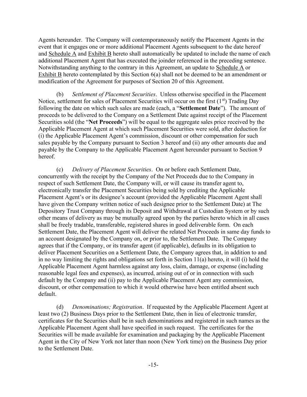 -15- Agents hereunder. The Company will contemporaneously notify the Placement Agents in the event that it engages one or more additional Placement Agents subsequent to the date hereof and Schedule A and Exhibit B hereto shall automatically be updated to include the name of each additional Placement Agent that has executed the joinder referenced in the preceding sentence. Notwithstanding anything to the contrary in this Agreement, an update to Schedule A or Exhibit B hereto contemplated by this Section 6(a) shall not be deemed to be an amendment or modification of the Agreement for purposes of Section 20 of this Agreement. (b) Settlement of Placement Securities. Unless otherwise specified in the Placement Notice, settlement for sales of Placement Securities will occur on the first (1st) Trading Day following the date on which such sales are made (each, a “Settlement Date”). The amount of proceeds to be delivered to the Company on a Settlement Date against receipt of the Placement Securities sold (the “Net Proceeds”) will be equal to the aggregate sales price received by the Applicable Placement Agent at which such Placement Securities were sold, after deduction for (i) the Applicable Placement Agent’s commission, discount or other compensation for such sales payable by the Company pursuant to Section 3 hereof and (ii) any other amounts due and payable by the Company to the Applicable Placement Agent hereunder pursuant to Section 9 hereof. (c) Delivery of Placement Securities. On or before each Settlement Date, concurrently with the receipt by the Company of the Net Proceeds due to the Company in respect of such Settlement Date, the Company will, or will cause its transfer agent to, electronically transfer the Placement Securities being sold by crediting the Applicable Placement Agent’s or its designee’s account (provided the Applicable Placement Agent shall have given the Company written notice of such designee prior to the Settlement Date) at The Depository Trust Company through its Deposit and Withdrawal at Custodian System or by such other means of delivery as may be mutually agreed upon by the parties hereto which in all cases shall be freely tradable, transferable, registered shares in good deliverable form. On each Settlement Date, the Placement Agent will deliver the related Net Proceeds in same day funds to an account designated by the Company on, or prior to, the Settlement Date. The Company agrees that if the Company, or its transfer agent (if applicable), defaults in its obligation to deliver Placement Securities on a Settlement Date, the Company agrees that, in addition to and in no way limiting the rights and obligations set forth in Section 11(a) hereto, it will (i) hold the Applicable Placement Agent harmless against any loss, claim, damage, or expense (including reasonable legal fees and expenses), as incurred, arising out of or in connection with such default by the Company and (ii) pay to the Applicable Placement Agent any commission, discount, or other compensation to which it would otherwise have been entitled absent such default. (d) Denominations; Registration. If requested by the Applicable Placement Agent at least two (2) Business Days prior to the Settlement Date, then in lieu of electronic transfer, certificates for the Securities shall be in such denominations and registered in such names as the Applicable Placement Agent shall have specified in such request. The certificates for the Securities will be made available for examination and packaging by the Applicable Placement Agent in the City of New York not later than noon (New York time) on the Business Day prior to the Settlement Date.