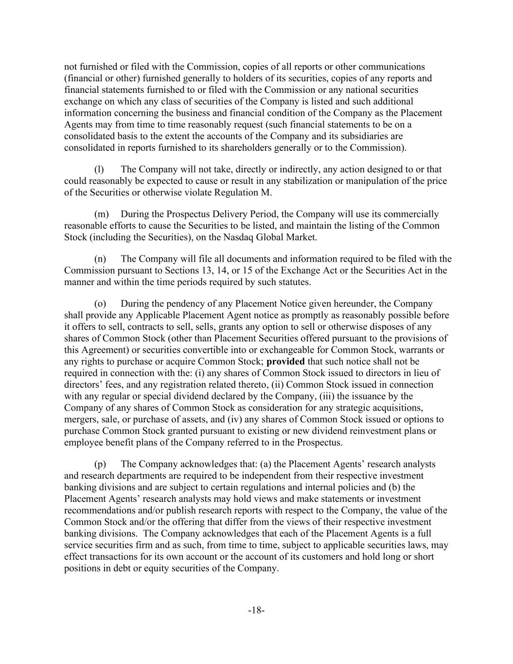 -18- not furnished or filed with the Commission, copies of all reports or other communications (financial or other) furnished generally to holders of its securities, copies of any reports and financial statements furnished to or filed with the Commission or any national securities exchange on which any class of securities of the Company is listed and such additional information concerning the business and financial condition of the Company as the Placement Agents may from time to time reasonably request (such financial statements to be on a consolidated basis to the extent the accounts of the Company and its subsidiaries are consolidated in reports furnished to its shareholders generally or to the Commission). (l) The Company will not take, directly or indirectly, any action designed to or that could reasonably be expected to cause or result in any stabilization or manipulation of the price of the Securities or otherwise violate Regulation M. (m) During the Prospectus Delivery Period, the Company will use its commercially reasonable efforts to cause the Securities to be listed, and maintain the listing of the Common Stock (including the Securities), on the Nasdaq Global Market. (n) The Company will file all documents and information required to be filed with the Commission pursuant to Sections 13, 14, or 15 of the Exchange Act or the Securities Act in the manner and within the time periods required by such statutes. (o) During the pendency of any Placement Notice given hereunder, the Company shall provide any Applicable Placement Agent notice as promptly as reasonably possible before it offers to sell, contracts to sell, sells, grants any option to sell or otherwise disposes of any shares of Common Stock (other than Placement Securities offered pursuant to the provisions of this Agreement) or securities convertible into or exchangeable for Common Stock, warrants or any rights to purchase or acquire Common Stock; provided that such notice shall not be required in connection with the: (i) any shares of Common Stock issued to directors in lieu of directors’ fees, and any registration related thereto, (ii) Common Stock issued in connection with any regular or special dividend declared by the Company, (iii) the issuance by the Company of any shares of Common Stock as consideration for any strategic acquisitions, mergers, sale, or purchase of assets, and (iv) any shares of Common Stock issued or options to purchase Common Stock granted pursuant to existing or new dividend reinvestment plans or employee benefit plans of the Company referred to in the Prospectus. (p) The Company acknowledges that: (a) the Placement Agents’ research analysts and research departments are required to be independent from their respective investment banking divisions and are subject to certain regulations and internal policies and (b) the Placement Agents’ research analysts may hold views and make statements or investment recommendations and/or publish research reports with respect to the Company, the value of the Common Stock and/or the offering that differ from the views of their respective investment banking divisions. The Company acknowledges that each of the Placement Agents is a full service securities firm and as such, from time to time, subject to applicable securities laws, may effect transactions for its own account or the account of its customers and hold long or short positions in debt or equity securities of the Company.