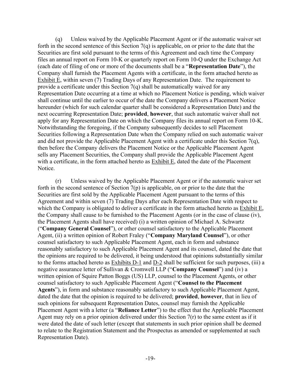 -19- (q) Unless waived by the Applicable Placement Agent or if the automatic waiver set forth in the second sentence of this Section 7(q) is applicable, on or prior to the date that the Securities are first sold pursuant to the terms of this Agreement and each time the Company files an annual report on Form 10-K or quarterly report on Form 10-Q under the Exchange Act (each date of filing of one or more of the documents shall be a “Representation Date”), the Company shall furnish the Placement Agents with a certificate, in the form attached hereto as Exhibit E, within seven (7) Trading Days of any Representation Date. The requirement to provide a certificate under this Section 7(q) shall be automatically waived for any Representation Date occurring at a time at which no Placement Notice is pending, which waiver shall continue until the earlier to occur of the date the Company delivers a Placement Notice hereunder (which for such calendar quarter shall be considered a Representation Date) and the next occurring Representation Date; provided, however, that such automatic waiver shall not apply for any Representation Date on which the Company files its annual report on Form 10-K. Notwithstanding the foregoing, if the Company subsequently decides to sell Placement Securities following a Representation Date when the Company relied on such automatic waiver and did not provide the Applicable Placement Agent with a certificate under this Section 7(q), then before the Company delivers the Placement Notice or the Applicable Placement Agent sells any Placement Securities, the Company shall provide the Applicable Placement Agent with a certificate, in the form attached hereto as Exhibit E, dated the date of the Placement Notice. (r) Unless waived by the Applicable Placement Agent or if the automatic waiver set forth in the second sentence of Section 7(p) is applicable, on or prior to the date that the Securities are first sold by the Applicable Placement Agent pursuant to the terms of this Agreement and within seven (7) Trading Days after each Representation Date with respect to which the Company is obligated to deliver a certificate in the form attached hereto as Exhibit E, the Company shall cause to be furnished to the Placement Agents (or in the case of clause (iv), the Placement Agents shall have received) (i) a written opinion of Michael A. Schwartz (“Company General Counsel”), or other counsel satisfactory to the Applicable Placement Agent, (ii) a written opinion of Robert Fraley (“Company Maryland Counsel”), or other counsel satisfactory to such Applicable Placement Agent, each in form and substance reasonably satisfactory to such Applicable Placement Agent and its counsel, dated the date that the opinions are required to be delivered, it being understood that opinions substantially similar to the forms attached hereto as Exhibits D-1 and D-2 shall be sufficient for such purposes, (iii) a negative assurance letter of Sullivan & Cromwell LLP (“Company Counsel”) and (iv) a written opinion of Squire Patton Boggs (US) LLP, counsel to the Placement Agents, or other counsel satisfactory to such Applicable Placement Agent (“Counsel to the Placement Agents”), in form and substance reasonably satisfactory to such Applicable Placement Agent, dated the date that the opinion is required to be delivered; provided, however, that in lieu of such opinions for subsequent Representation Dates, counsel may furnish the Applicable Placement Agent with a letter (a “Reliance Letter”) to the effect that the Applicable Placement Agent may rely on a prior opinion delivered under this Section 7(r) to the same extent as if it were dated the date of such letter (except that statements in such prior opinion shall be deemed to relate to the Registration Statement and the Prospectus as amended or supplemented at such Representation Date).