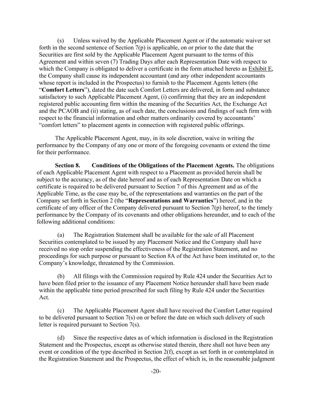 -20- (s) Unless waived by the Applicable Placement Agent or if the automatic waiver set forth in the second sentence of Section 7(p) is applicable, on or prior to the date that the Securities are first sold by the Applicable Placement Agent pursuant to the terms of this Agreement and within seven (7) Trading Days after each Representation Date with respect to which the Company is obligated to deliver a certificate in the form attached hereto as Exhibit E, the Company shall cause its independent accountant (and any other independent accountants whose report is included in the Prospectus) to furnish to the Placement Agents letters (the “Comfort Letters”), dated the date such Comfort Letters are delivered, in form and substance satisfactory to such Applicable Placement Agent, (i) confirming that they are an independent registered public accounting firm within the meaning of the Securities Act, the Exchange Act and the PCAOB and (ii) stating, as of such date, the conclusions and findings of such firm with respect to the financial information and other matters ordinarily covered by accountants’ “comfort letters” to placement agents in connection with registered public offerings. The Applicable Placement Agent, may, in its sole discretion, waive in writing the performance by the Company of any one or more of the foregoing covenants or extend the time for their performance. Section 8. Conditions of the Obligations of the Placement Agents. The obligations of each Applicable Placement Agent with respect to a Placement as provided herein shall be subject to the accuracy, as of the date hereof and as of each Representation Date on which a certificate is required to be delivered pursuant to Section 7 of this Agreement and as of the Applicable Time, as the case may be, of the representations and warranties on the part of the Company set forth in Section 2 (the “Representations and Warranties”) hereof, and in the certificate of any officer of the Company delivered pursuant to Section 7(p) hereof, to the timely performance by the Company of its covenants and other obligations hereunder, and to each of the following additional conditions: (a) The Registration Statement shall be available for the sale of all Placement Securities contemplated to be issued by any Placement Notice and the Company shall have received no stop order suspending the effectiveness of the Registration Statement, and no proceedings for such purpose or pursuant to Section 8A of the Act have been instituted or, to the Company’s knowledge, threatened by the Commission. (b) All filings with the Commission required by Rule 424 under the Securities Act to have been filed prior to the issuance of any Placement Notice hereunder shall have been made within the applicable time period prescribed for such filing by Rule 424 under the Securities Act. (c) The Applicable Placement Agent shall have received the Comfort Letter required to be delivered pursuant to Section 7(s) on or before the date on which such delivery of such letter is required pursuant to Section 7(s). (d) Since the respective dates as of which information is disclosed in the Registration Statement and the Prospectus, except as otherwise stated therein, there shall not have been any event or condition of the type described in Section 2(f), except as set forth in or contemplated in the Registration Statement and the Prospectus, the effect of which is, in the reasonable judgment