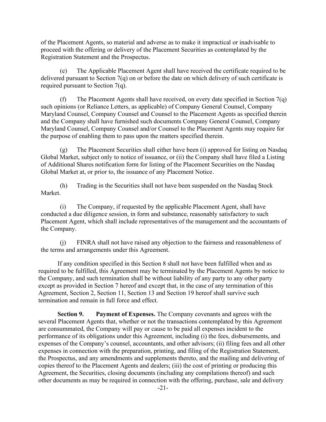 -21- of the Placement Agents, so material and adverse as to make it impractical or inadvisable to proceed with the offering or delivery of the Placement Securities as contemplated by the Registration Statement and the Prospectus. (e) The Applicable Placement Agent shall have received the certificate required to be delivered pursuant to Section 7(q) on or before the date on which delivery of such certificate is required pursuant to Section 7(q). (f) The Placement Agents shall have received, on every date specified in Section 7(q) such opinions (or Reliance Letters, as applicable) of Company General Counsel, Company Maryland Counsel, Company Counsel and Counsel to the Placement Agents as specified therein and the Company shall have furnished such documents Company General Counsel, Company Maryland Counsel, Company Counsel and/or Counsel to the Placement Agents may require for the purpose of enabling them to pass upon the matters specified therein. (g) The Placement Securities shall either have been (i) approved for listing on Nasdaq Global Market, subject only to notice of issuance, or (ii) the Company shall have filed a Listing of Additional Shares notification form for listing of the Placement Securities on the Nasdaq Global Market at, or prior to, the issuance of any Placement Notice. (h) Trading in the Securities shall not have been suspended on the Nasdaq Stock Market. (i) The Company, if requested by the applicable Placement Agent, shall have conducted a due diligence session, in form and substance, reasonably satisfactory to such Placement Agent, which shall include representatives of the management and the accountants of the Company. (j) FINRA shall not have raised any objection to the fairness and reasonableness of the terms and arrangements under this Agreement. If any condition specified in this Section 8 shall not have been fulfilled when and as required to be fulfilled, this Agreement may be terminated by the Placement Agents by notice to the Company, and such termination shall be without liability of any party to any other party except as provided in Section 7 hereof and except that, in the case of any termination of this Agreement, Section 2, Section 11, Section 13 and Section 19 hereof shall survive such termination and remain in full force and effect. Section 9. Payment of Expenses. The Company covenants and agrees with the several Placement Agents that, whether or not the transactions contemplated by this Agreement are consummated, the Company will pay or cause to be paid all expenses incident to the performance of its obligations under this Agreement, including (i) the fees, disbursements, and expenses of the Company’s counsel, accountants, and other advisors; (ii) filing fees and all other expenses in connection with the preparation, printing, and filing of the Registration Statement, the Prospectus, and any amendments and supplements thereto, and the mailing and delivering of copies thereof to the Placement Agents and dealers; (iii) the cost of printing or producing this Agreement, the Securities, closing documents (including any compilations thereof) and such other documents as may be required in connection with the offering, purchase, sale and delivery
