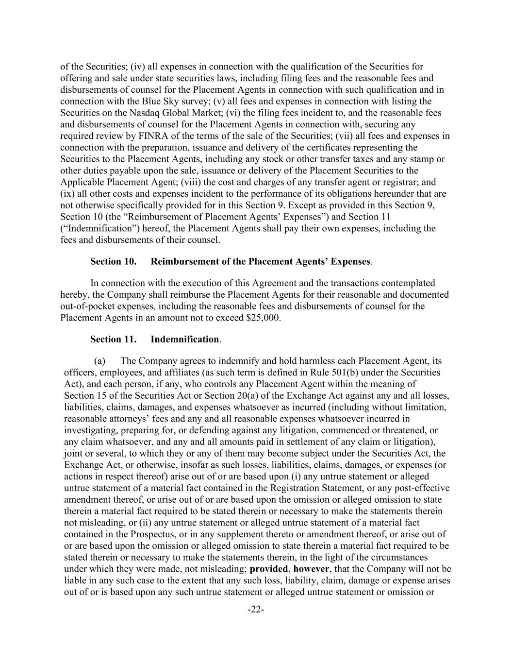 -22- of the Securities; (iv) all expenses in connection with the qualification of the Securities for offering and sale under state securities laws, including filing fees and the reasonable fees and disbursements of counsel for the Placement Agents in connection with such qualification and in connection with the Blue Sky survey; (v) all fees and expenses in connection with listing the Securities on the Nasdaq Global Market; (vi) the filing fees incident to, and the reasonable fees and disbursements of counsel for the Placement Agents in connection with, securing any required review by FINRA of the terms of the sale of the Securities; (vii) all fees and expenses in connection with the preparation, issuance and delivery of the certificates representing the Securities to the Placement Agents, including any stock or other transfer taxes and any stamp or other duties payable upon the sale, issuance or delivery of the Placement Securities to the Applicable Placement Agent; (viii) the cost and charges of any transfer agent or registrar; and (ix) all other costs and expenses incident to the performance of its obligations hereunder that are not otherwise specifically provided for in this Section 9. Except as provided in this Section 9, Section 10 (the “Reimbursement of Placement Agents’ Expenses”) and Section 11 (“Indemnification”) hereof, the Placement Agents shall pay their own expenses, including the fees and disbursements of their counsel. Section 10. Reimbursement of the Placement Agents’ Expenses. In connection with the execution of this Agreement and the transactions contemplated hereby, the Company shall reimburse the Placement Agents for their reasonable and documented out-of-pocket expenses, including the reasonable fees and disbursements of counsel for the Placement Agents in an amount not to exceed $25,000. Section 11. Indemnification. (a) The Company agrees to indemnify and hold harmless each Placement Agent, its officers, employees, and affiliates (as such term is defined in Rule 501(b) under the Securities Act), and each person, if any, who controls any Placement Agent within the meaning of Section 15 of the Securities Act or Section 20(a) of the Exchange Act against any and all losses, liabilities, claims, damages, and expenses whatsoever as incurred (including without limitation, reasonable attorneys’ fees and any and all reasonable expenses whatsoever incurred in investigating, preparing for, or defending against any litigation, commenced or threatened, or any claim whatsoever, and any and all amounts paid in settlement of any claim or litigation), joint or several, to which they or any of them may become subject under the Securities Act, the Exchange Act, or otherwise, insofar as such losses, liabilities, claims, damages, or expenses (or actions in respect thereof) arise out of or are based upon (i) any untrue statement or alleged untrue statement of a material fact contained in the Registration Statement, or any post-effective amendment thereof, or arise out of or are based upon the omission or alleged omission to state therein a material fact required to be stated therein or necessary to make the statements therein not misleading, or (ii) any untrue statement or alleged untrue statement of a material fact contained in the Prospectus, or in any supplement thereto or amendment thereof, or arise out of or are based upon the omission or alleged omission to state therein a material fact required to be stated therein or necessary to make the statements therein, in the light of the circumstances under which they were made, not misleading; provided, however, that the Company will not be liable in any such case to the extent that any such loss, liability, claim, damage or expense arises out of or is based upon any such untrue statement or alleged untrue statement or omission or