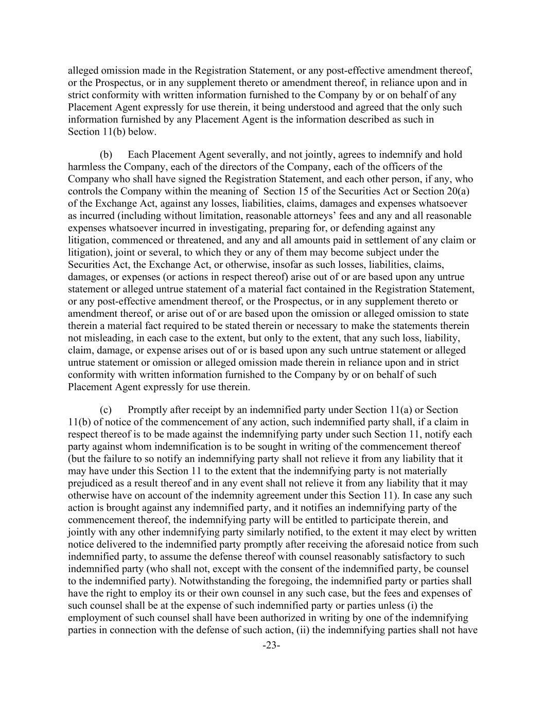 -23- alleged omission made in the Registration Statement, or any post-effective amendment thereof, or the Prospectus, or in any supplement thereto or amendment thereof, in reliance upon and in strict conformity with written information furnished to the Company by or on behalf of any Placement Agent expressly for use therein, it being understood and agreed that the only such information furnished by any Placement Agent is the information described as such in Section 11(b) below. (b) Each Placement Agent severally, and not jointly, agrees to indemnify and hold harmless the Company, each of the directors of the Company, each of the officers of the Company who shall have signed the Registration Statement, and each other person, if any, who controls the Company within the meaning of Section 15 of the Securities Act or Section 20(a) of the Exchange Act, against any losses, liabilities, claims, damages and expenses whatsoever as incurred (including without limitation, reasonable attorneys’ fees and any and all reasonable expenses whatsoever incurred in investigating, preparing for, or defending against any litigation, commenced or threatened, and any and all amounts paid in settlement of any claim or litigation), joint or several, to which they or any of them may become subject under the Securities Act, the Exchange Act, or otherwise, insofar as such losses, liabilities, claims, damages, or expenses (or actions in respect thereof) arise out of or are based upon any untrue statement or alleged untrue statement of a material fact contained in the Registration Statement, or any post-effective amendment thereof, or the Prospectus, or in any supplement thereto or amendment thereof, or arise out of or are based upon the omission or alleged omission to state therein a material fact required to be stated therein or necessary to make the statements therein not misleading, in each case to the extent, but only to the extent, that any such loss, liability, claim, damage, or expense arises out of or is based upon any such untrue statement or alleged untrue statement or omission or alleged omission made therein in reliance upon and in strict conformity with written information furnished to the Company by or on behalf of such Placement Agent expressly for use therein. (c) Promptly after receipt by an indemnified party under Section 11(a) or Section 11(b) of notice of the commencement of any action, such indemnified party shall, if a claim in respect thereof is to be made against the indemnifying party under such Section 11, notify each party against whom indemnification is to be sought in writing of the commencement thereof (but the failure to so notify an indemnifying party shall not relieve it from any liability that it may have under this Section 11 to the extent that the indemnifying party is not materially prejudiced as a result thereof and in any event shall not relieve it from any liability that it may otherwise have on account of the indemnity agreement under this Section 11). In case any such action is brought against any indemnified party, and it notifies an indemnifying party of the commencement thereof, the indemnifying party will be entitled to participate therein, and jointly with any other indemnifying party similarly notified, to the extent it may elect by written notice delivered to the indemnified party promptly after receiving the aforesaid notice from such indemnified party, to assume the defense thereof with counsel reasonably satisfactory to such indemnified party (who shall not, except with the consent of the indemnified party, be counsel to the indemnified party). Notwithstanding the foregoing, the indemnified party or parties shall have the right to employ its or their own counsel in any such case, but the fees and expenses of such counsel shall be at the expense of such indemnified party or parties unless (i) the employment of such counsel shall have been authorized in writing by one of the indemnifying parties in connection with the defense of such action, (ii) the indemnifying parties shall not have