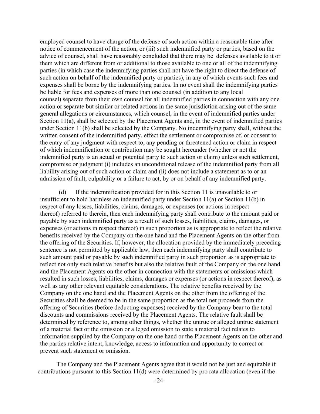 -24- employed counsel to have charge of the defense of such action within a reasonable time after notice of commencement of the action, or (iii) such indemnified party or parties, based on the advice of counsel, shall have reasonably concluded that there may be defenses available to it or them which are different from or additional to those available to one or all of the indemnifying parties (in which case the indemnifying parties shall not have the right to direct the defense of such action on behalf of the indemnified party or parties), in any of which events such fees and expenses shall be borne by the indemnifying parties. In no event shall the indemnifying parties be liable for fees and expenses of more than one counsel (in addition to any local counsel) separate from their own counsel for all indemnified parties in connection with any one action or separate but similar or related actions in the same jurisdiction arising out of the same general allegations or circumstances, which counsel, in the event of indemnified parties under Section 11(a), shall be selected by the Placement Agents and, in the event of indemnified parties under Section 11(b) shall be selected by the Company. No indemnifying party shall, without the written consent of the indemnified party, effect the settlement or compromise of, or consent to the entry of any judgment with respect to, any pending or threatened action or claim in respect of which indemnification or contribution may be sought hereunder (whether or not the indemnified party is an actual or potential party to such action or claim) unless such settlement, compromise or judgment (i) includes an unconditional release of the indemnified party from all liability arising out of such action or claim and (ii) does not include a statement as to or an admission of fault, culpability or a failure to act, by or on behalf of any indemnified party. (d) If the indemnification provided for in this Section 11 is unavailable to or insufficient to hold harmless an indemnified party under Section 11(a) or Section 11(b) in respect of any losses, liabilities, claims, damages, or expenses (or actions in respect thereof) referred to therein, then each indemnifying party shall contribute to the amount paid or payable by such indemnified party as a result of such losses, liabilities, claims, damages, or expenses (or actions in respect thereof) in such proportion as is appropriate to reflect the relative benefits received by the Company on the one hand and the Placement Agents on the other from the offering of the Securities. If, however, the allocation provided by the immediately preceding sentence is not permitted by applicable law, then each indemnifying party shall contribute to such amount paid or payable by such indemnified party in such proportion as is appropriate to reflect not only such relative benefits but also the relative fault of the Company on the one hand and the Placement Agents on the other in connection with the statements or omissions which resulted in such losses, liabilities, claims, damages or expenses (or actions in respect thereof), as well as any other relevant equitable considerations. The relative benefits received by the Company on the one hand and the Placement Agents on the other from the offering of the Securities shall be deemed to be in the same proportion as the total net proceeds from the offering of Securities (before deducting expenses) received by the Company bear to the total discounts and commissions received by the Placement Agents. The relative fault shall be determined by reference to, among other things, whether the untrue or alleged untrue statement of a material fact or the omission or alleged omission to state a material fact relates to information supplied by the Company on the one hand or the Placement Agents on the other and the parties relative intent, knowledge, access to information and opportunity to correct or prevent such statement or omission. The Company and the Placement Agents agree that it would not be just and equitable if contributions pursuant to this Section 11(d) were determined by pro rata allocation (even if the