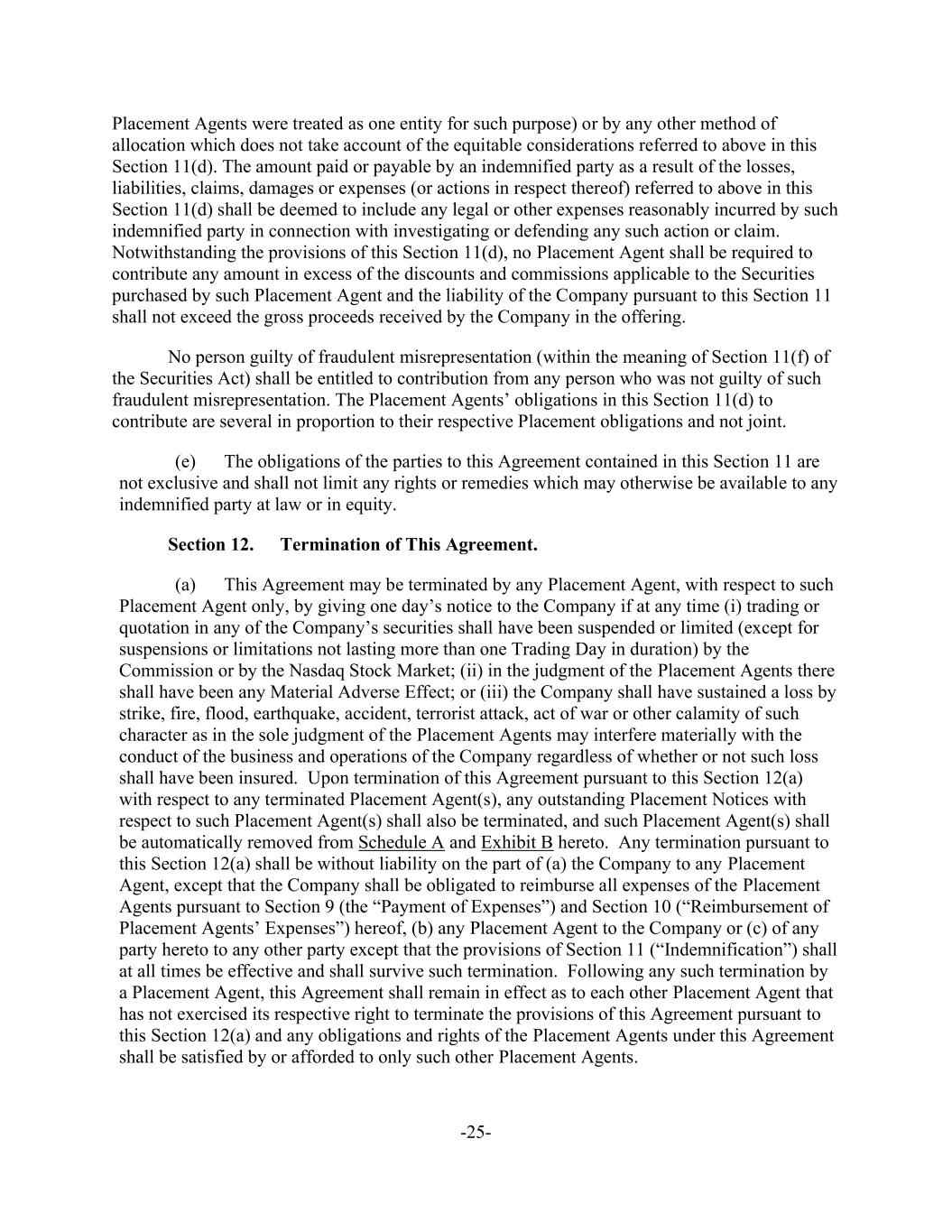-25- Placement Agents were treated as one entity for such purpose) or by any other method of allocation which does not take account of the equitable considerations referred to above in this Section 11(d). The amount paid or payable by an indemnified party as a result of the losses, liabilities, claims, damages or expenses (or actions in respect thereof) referred to above in this Section 11(d) shall be deemed to include any legal or other expenses reasonably incurred by such indemnified party in connection with investigating or defending any such action or claim. Notwithstanding the provisions of this Section 11(d), no Placement Agent shall be required to contribute any amount in excess of the discounts and commissions applicable to the Securities purchased by such Placement Agent and the liability of the Company pursuant to this Section 11 shall not exceed the gross proceeds received by the Company in the offering. No person guilty of fraudulent misrepresentation (within the meaning of Section 11(f) of the Securities Act) shall be entitled to contribution from any person who was not guilty of such fraudulent misrepresentation. The Placement Agents’ obligations in this Section 11(d) to contribute are several in proportion to their respective Placement obligations and not joint. (e) The obligations of the parties to this Agreement contained in this Section 11 are not exclusive and shall not limit any rights or remedies which may otherwise be available to any indemnified party at law or in equity. Section 12. Termination of This Agreement. (a) This Agreement may be terminated by any Placement Agent, with respect to such Placement Agent only, by giving one day’s notice to the Company if at any time (i) trading or quotation in any of the Company’s securities shall have been suspended or limited (except for suspensions or limitations not lasting more than one Trading Day in duration) by the Commission or by the Nasdaq Stock Market; (ii) in the judgment of the Placement Agents there shall have been any Material Adverse Effect; or (iii) the Company shall have sustained a loss by strike, fire, flood, earthquake, accident, terrorist attack, act of war or other calamity of such character as in the sole judgment of the Placement Agents may interfere materially with the conduct of the business and operations of the Company regardless of whether or not such loss shall have been insured. Upon termination of this Agreement pursuant to this Section 12(a) with respect to any terminated Placement Agent(s), any outstanding Placement Notices with respect to such Placement Agent(s) shall also be terminated, and such Placement Agent(s) shall be automatically removed from Schedule A and Exhibit B hereto. Any termination pursuant to this Section 12(a) shall be without liability on the part of (a) the Company to any Placement Agent, except that the Company shall be obligated to reimburse all expenses of the Placement Agents pursuant to Section 9 (the “Payment of Expenses”) and Section 10 (“Reimbursement of Placement Agents’ Expenses”) hereof, (b) any Placement Agent to the Company or (c) of any party hereto to any other party except that the provisions of Section 11 (“Indemnification”) shall at all times be effective and shall survive such termination. Following any such termination by a Placement Agent, this Agreement shall remain in effect as to each other Placement Agent that has not exercised its respective right to terminate the provisions of this Agreement pursuant to this Section 12(a) and any obligations and rights of the Placement Agents under this Agreement shall be satisfied by or afforded to only such other Placement Agents.