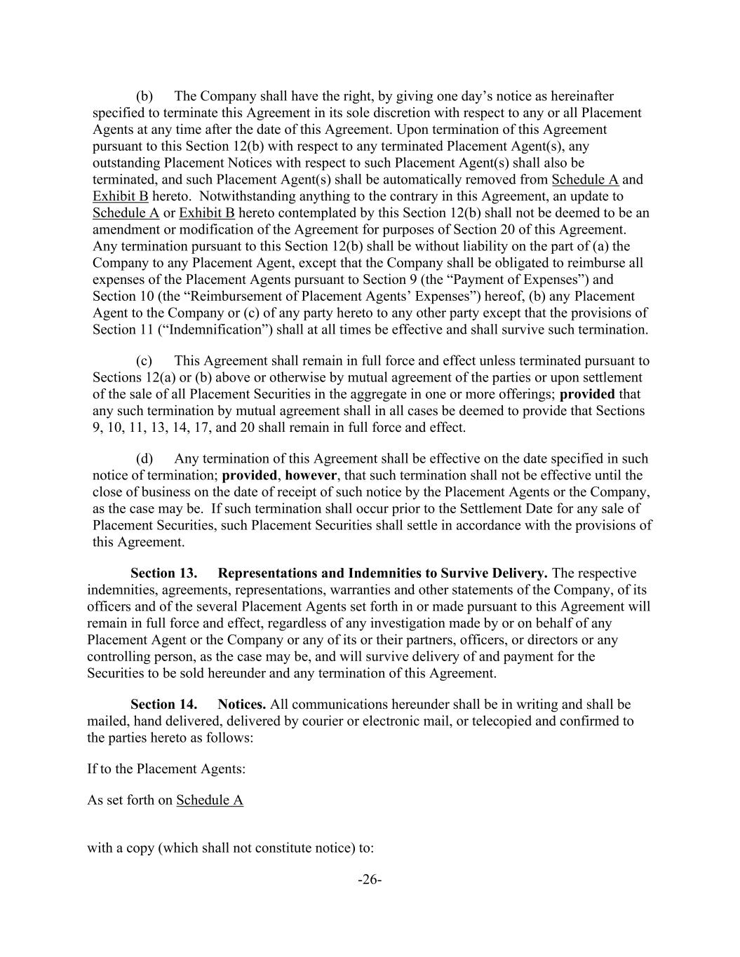 -26- (b) The Company shall have the right, by giving one day’s notice as hereinafter specified to terminate this Agreement in its sole discretion with respect to any or all Placement Agents at any time after the date of this Agreement. Upon termination of this Agreement pursuant to this Section 12(b) with respect to any terminated Placement Agent(s), any outstanding Placement Notices with respect to such Placement Agent(s) shall also be terminated, and such Placement Agent(s) shall be automatically removed from Schedule A and Exhibit B hereto. Notwithstanding anything to the contrary in this Agreement, an update to Schedule A or Exhibit B hereto contemplated by this Section 12(b) shall not be deemed to be an amendment or modification of the Agreement for purposes of Section 20 of this Agreement. Any termination pursuant to this Section 12(b) shall be without liability on the part of (a) the Company to any Placement Agent, except that the Company shall be obligated to reimburse all expenses of the Placement Agents pursuant to Section 9 (the “Payment of Expenses”) and Section 10 (the “Reimbursement of Placement Agents’ Expenses”) hereof, (b) any Placement Agent to the Company or (c) of any party hereto to any other party except that the provisions of Section 11 (“Indemnification”) shall at all times be effective and shall survive such termination. (c) This Agreement shall remain in full force and effect unless terminated pursuant to Sections 12(a) or (b) above or otherwise by mutual agreement of the parties or upon settlement of the sale of all Placement Securities in the aggregate in one or more offerings; provided that any such termination by mutual agreement shall in all cases be deemed to provide that Sections 9, 10, 11, 13, 14, 17, and 20 shall remain in full force and effect. (d) Any termination of this Agreement shall be effective on the date specified in such notice of termination; provided, however, that such termination shall not be effective until the close of business on the date of receipt of such notice by the Placement Agents or the Company, as the case may be. If such termination shall occur prior to the Settlement Date for any sale of Placement Securities, such Placement Securities shall settle in accordance with the provisions of this Agreement. Section 13. Representations and Indemnities to Survive Delivery. The respective indemnities, agreements, representations, warranties and other statements of the Company, of its officers and of the several Placement Agents set forth in or made pursuant to this Agreement will remain in full force and effect, regardless of any investigation made by or on behalf of any Placement Agent or the Company or any of its or their partners, officers, or directors or any controlling person, as the case may be, and will survive delivery of and payment for the Securities to be sold hereunder and any termination of this Agreement. Section 14. Notices. All communications hereunder shall be in writing and shall be mailed, hand delivered, delivered by courier or electronic mail, or telecopied and confirmed to the parties hereto as follows: If to the Placement Agents: As set forth on Schedule A with a copy (which shall not constitute notice) to: