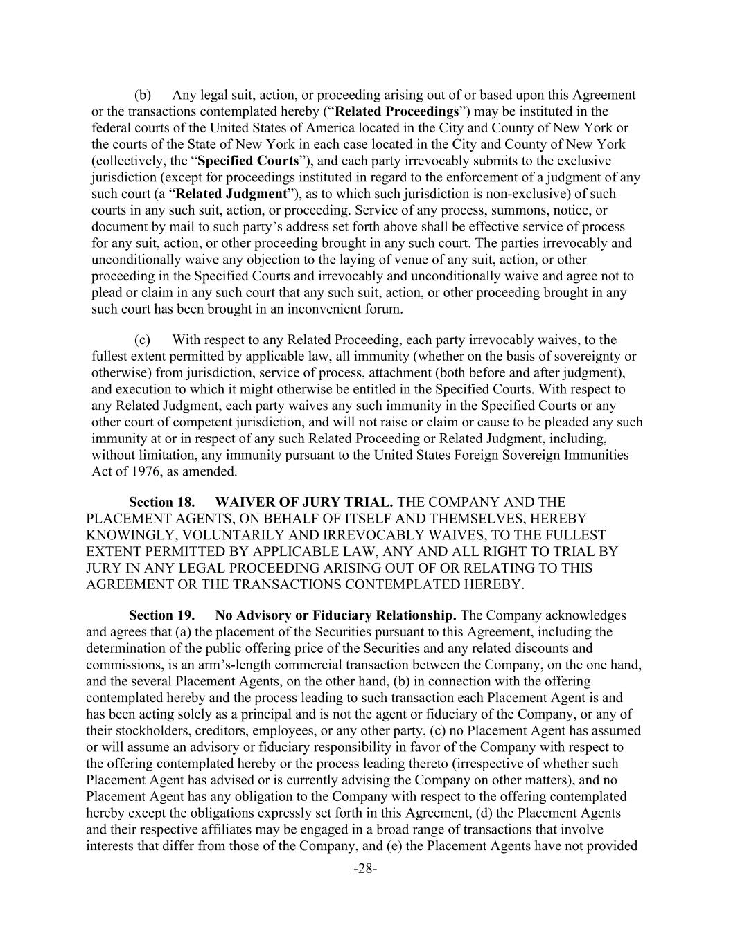 -28- (b) Any legal suit, action, or proceeding arising out of or based upon this Agreement or the transactions contemplated hereby (“Related Proceedings”) may be instituted in the federal courts of the United States of America located in the City and County of New York or the courts of the State of New York in each case located in the City and County of New York (collectively, the “Specified Courts”), and each party irrevocably submits to the exclusive jurisdiction (except for proceedings instituted in regard to the enforcement of a judgment of any such court (a “Related Judgment”), as to which such jurisdiction is non-exclusive) of such courts in any such suit, action, or proceeding. Service of any process, summons, notice, or document by mail to such party’s address set forth above shall be effective service of process for any suit, action, or other proceeding brought in any such court. The parties irrevocably and unconditionally waive any objection to the laying of venue of any suit, action, or other proceeding in the Specified Courts and irrevocably and unconditionally waive and agree not to plead or claim in any such court that any such suit, action, or other proceeding brought in any such court has been brought in an inconvenient forum. (c) With respect to any Related Proceeding, each party irrevocably waives, to the fullest extent permitted by applicable law, all immunity (whether on the basis of sovereignty or otherwise) from jurisdiction, service of process, attachment (both before and after judgment), and execution to which it might otherwise be entitled in the Specified Courts. With respect to any Related Judgment, each party waives any such immunity in the Specified Courts or any other court of competent jurisdiction, and will not raise or claim or cause to be pleaded any such immunity at or in respect of any such Related Proceeding or Related Judgment, including, without limitation, any immunity pursuant to the United States Foreign Sovereign Immunities Act of 1976, as amended. Section 18. WAIVER OF JURY TRIAL. THE COMPANY AND THE PLACEMENT AGENTS, ON BEHALF OF ITSELF AND THEMSELVES, HEREBY KNOWINGLY, VOLUNTARILY AND IRREVOCABLY WAIVES, TO THE FULLEST EXTENT PERMITTED BY APPLICABLE LAW, ANY AND ALL RIGHT TO TRIAL BY JURY IN ANY LEGAL PROCEEDING ARISING OUT OF OR RELATING TO THIS AGREEMENT OR THE TRANSACTIONS CONTEMPLATED HEREBY. Section 19. No Advisory or Fiduciary Relationship. The Company acknowledges and agrees that (a) the placement of the Securities pursuant to this Agreement, including the determination of the public offering price of the Securities and any related discounts and commissions, is an arm’s-length commercial transaction between the Company, on the one hand, and the several Placement Agents, on the other hand, (b) in connection with the offering contemplated hereby and the process leading to such transaction each Placement Agent is and has been acting solely as a principal and is not the agent or fiduciary of the Company, or any of their stockholders, creditors, employees, or any other party, (c) no Placement Agent has assumed or will assume an advisory or fiduciary responsibility in favor of the Company with respect to the offering contemplated hereby or the process leading thereto (irrespective of whether such Placement Agent has advised or is currently advising the Company on other matters), and no Placement Agent has any obligation to the Company with respect to the offering contemplated hereby except the obligations expressly set forth in this Agreement, (d) the Placement Agents and their respective affiliates may be engaged in a broad range of transactions that involve interests that differ from those of the Company, and (e) the Placement Agents have not provided