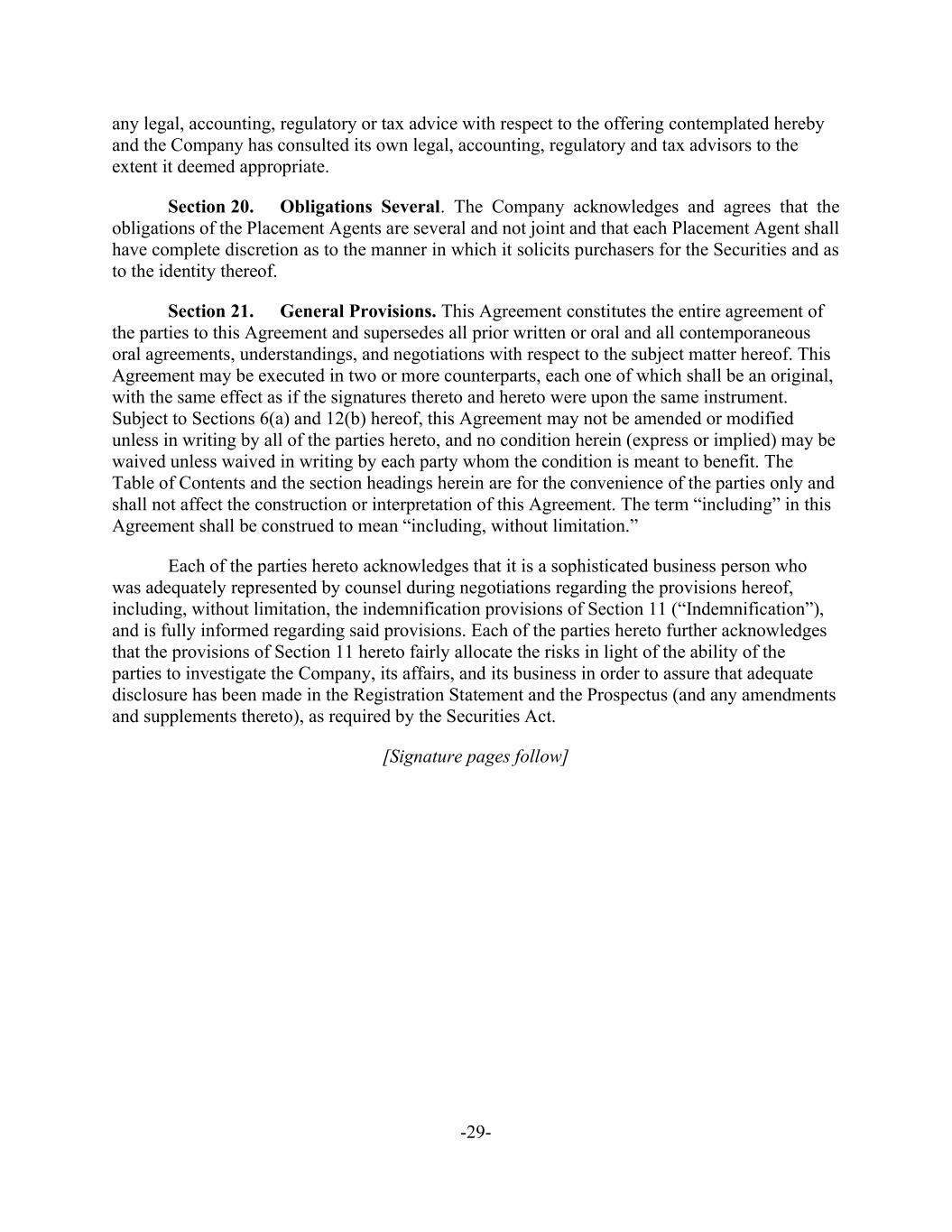 -29- any legal, accounting, regulatory or tax advice with respect to the offering contemplated hereby and the Company has consulted its own legal, accounting, regulatory and tax advisors to the extent it deemed appropriate. Section 20. Obligations Several. The Company acknowledges and agrees that the obligations of the Placement Agents are several and not joint and that each Placement Agent shall have complete discretion as to the manner in which it solicits purchasers for the Securities and as to the identity thereof. Section 21. General Provisions. This Agreement constitutes the entire agreement of the parties to this Agreement and supersedes all prior written or oral and all contemporaneous oral agreements, understandings, and negotiations with respect to the subject matter hereof. This Agreement may be executed in two or more counterparts, each one of which shall be an original, with the same effect as if the signatures thereto and hereto were upon the same instrument. Subject to Sections 6(a) and 12(b) hereof, this Agreement may not be amended or modified unless in writing by all of the parties hereto, and no condition herein (express or implied) may be waived unless waived in writing by each party whom the condition is meant to benefit. The Table of Contents and the section headings herein are for the convenience of the parties only and shall not affect the construction or interpretation of this Agreement. The term “including” in this Agreement shall be construed to mean “including, without limitation.” Each of the parties hereto acknowledges that it is a sophisticated business person who was adequately represented by counsel during negotiations regarding the provisions hereof, including, without limitation, the indemnification provisions of Section 11 (“Indemnification”), and is fully informed regarding said provisions. Each of the parties hereto further acknowledges that the provisions of Section 11 hereto fairly allocate the risks in light of the ability of the parties to investigate the Company, its affairs, and its business in order to assure that adequate disclosure has been made in the Registration Statement and the Prospectus (and any amendments and supplements thereto), as required by the Securities Act. [Signature pages follow]