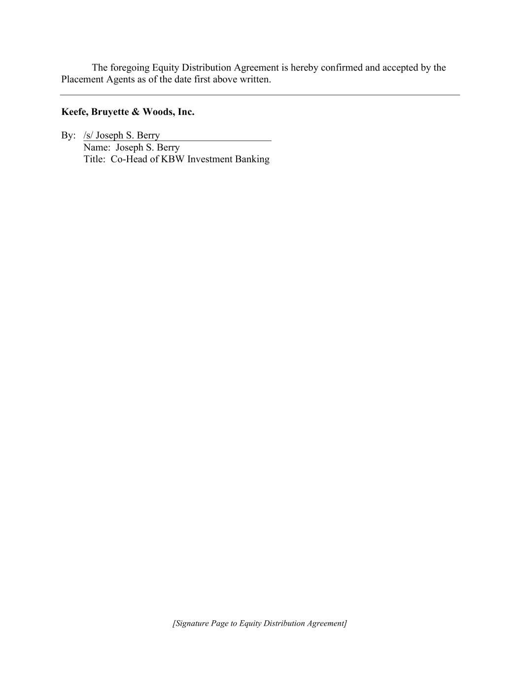 [Signature Page to Equity Distribution Agreement] The foregoing Equity Distribution Agreement is hereby confirmed and accepted by the Placement Agents as of the date first above written. Keefe, Bruyette & Woods, Inc. By: /s/ Joseph S. Berry Name: Joseph S. Berry Title: Co-Head of KBW Investment Banking
