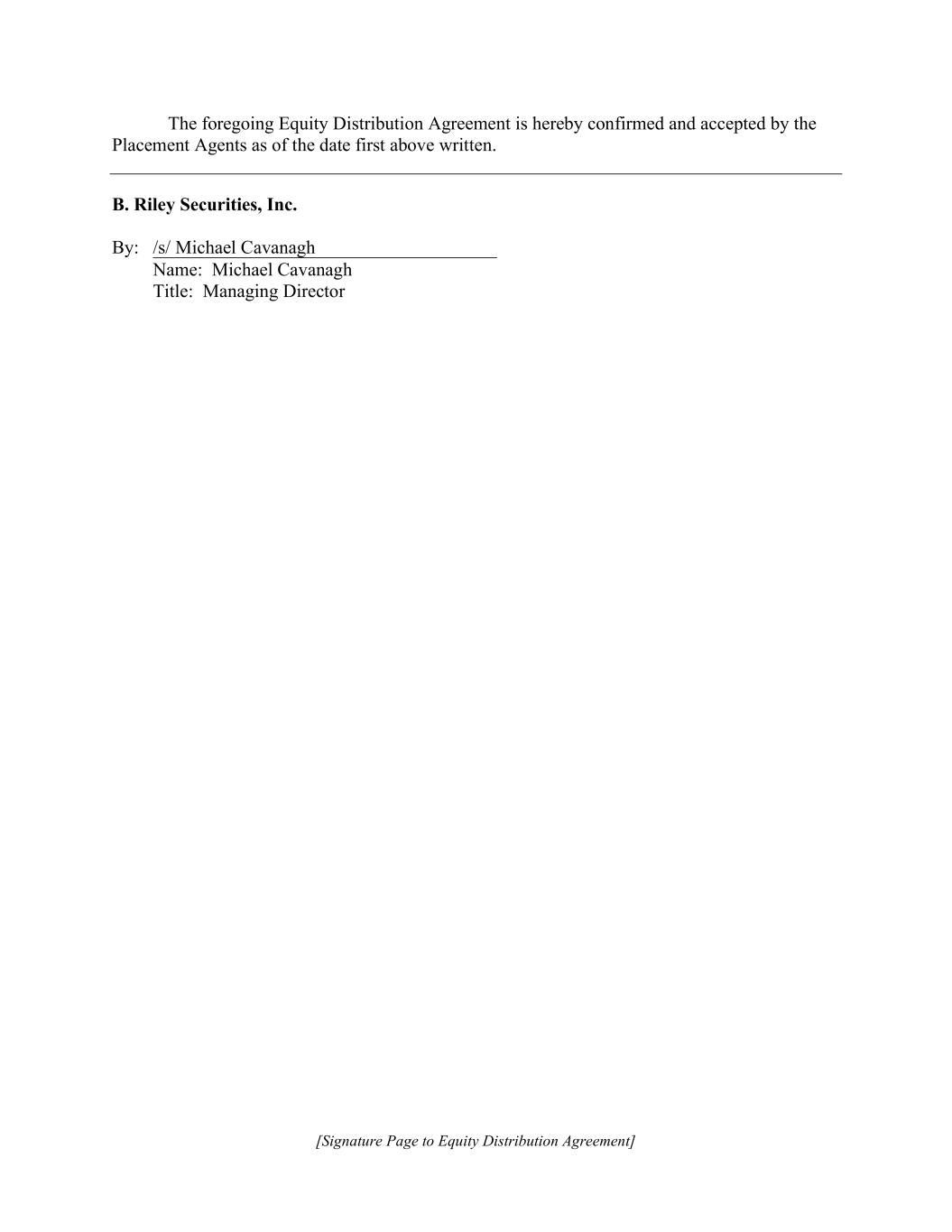 [Signature Page to Equity Distribution Agreement] The foregoing Equity Distribution Agreement is hereby confirmed and accepted by the Placement Agents as of the date first above written. B. Riley Securities, Inc. By: /s/ Michael Cavanagh Name: Michael Cavanagh Title: Managing Director