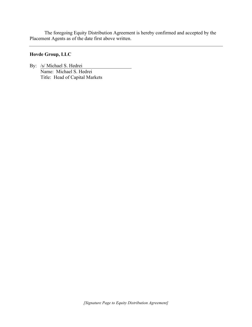 [Signature Page to Equity Distribution Agreement] The foregoing Equity Distribution Agreement is hereby confirmed and accepted by the Placement Agents as of the date first above written. Hovde Group, LLC By: /s/ Michael S. Hedrei Name: Michael S. Hedrei Title: Head of Capital Markets
