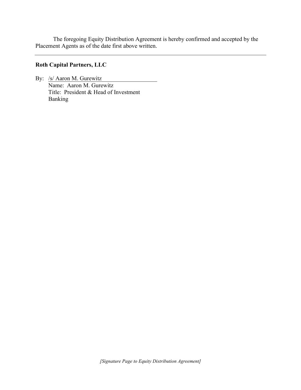 [Signature Page to Equity Distribution Agreement] The foregoing Equity Distribution Agreement is hereby confirmed and accepted by the Placement Agents as of the date first above written. Roth Capital Partners, LLC By: /s/ Aaron M. Gurewitz Name: Aaron M. Gurewitz Title: President & Head of Investment Banking