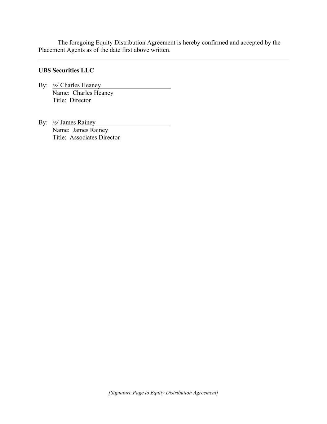 [Signature Page to Equity Distribution Agreement] The foregoing Equity Distribution Agreement is hereby confirmed and accepted by the Placement Agents as of the date first above written. UBS Securities LLC By: /s/ Charles Heaney Name: Charles Heaney Title: Director By: /s/ James Rainey Name: James Rainey Title: Associates Director