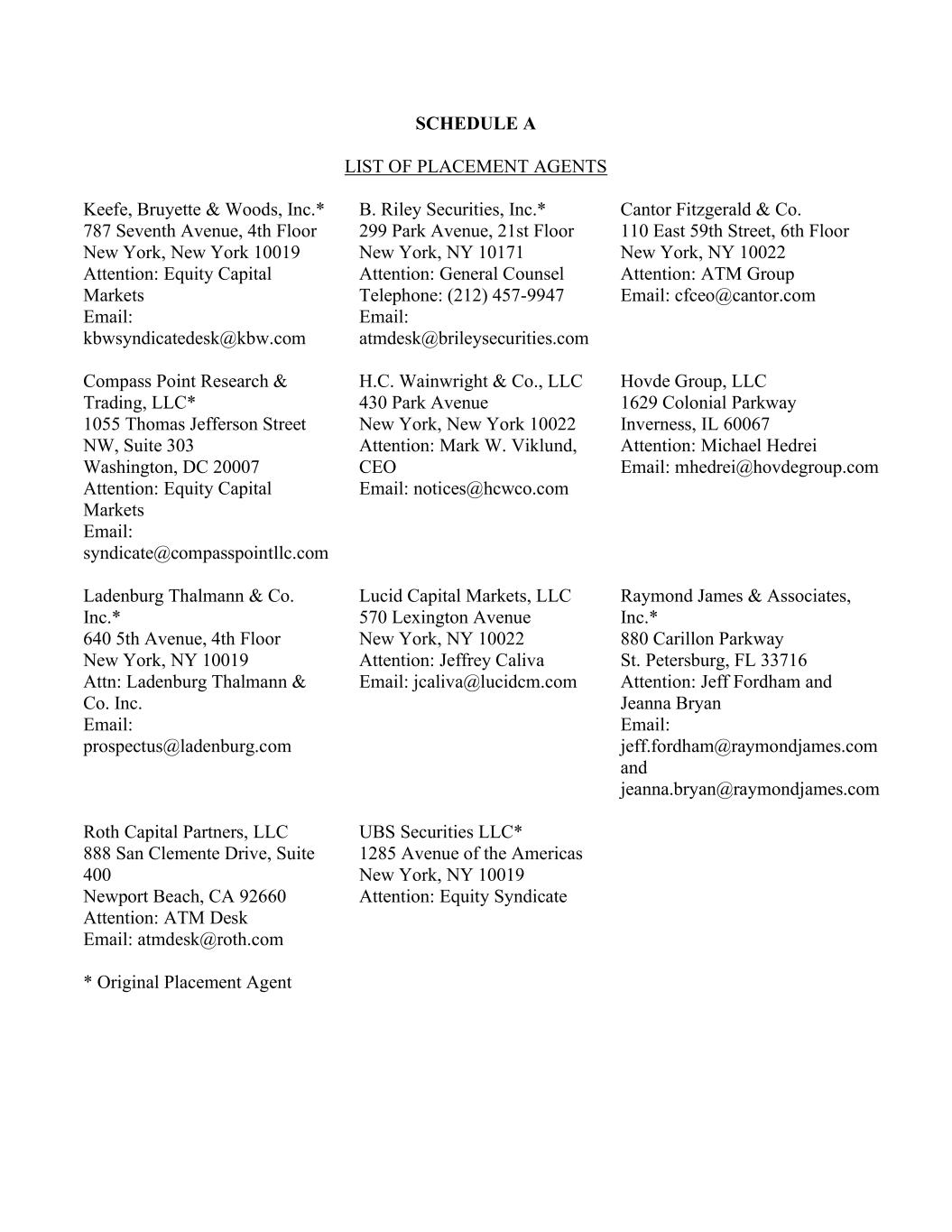 SCHEDULE A LIST OF PLACEMENT AGENTS Keefe, Bruyette & Woods, Inc.* 787 Seventh Avenue, 4th Floor New York, New York 10019 Attention: Equity Capital Markets Email: kbwsyndicatedesk@kbw.com B. Riley Securities, Inc.* 299 Park Avenue, 21st Floor New York, NY 10171 Attention: General Counsel Telephone: (212) 457-9947 Email: atmdesk@brileysecurities.com Cantor Fitzgerald & Co. 110 East 59th Street, 6th Floor New York, NY 10022 Attention: ATM Group Email: cfceo@cantor.com Compass Point Research & Trading, LLC* 1055 Thomas Jefferson Street NW, Suite 303 Washington, DC 20007 Attention: Equity Capital Markets Email: syndicate@compasspointllc.com H.C. Wainwright & Co., LLC 430 Park Avenue New York, New York 10022 Attention: Mark W. Viklund, CEO Email: notices@hcwco.com Hovde Group, LLC 1629 Colonial Parkway Inverness, IL 60067 Attention: Michael Hedrei Email: mhedrei@hovdegroup.com Ladenburg Thalmann & Co. Inc.* 640 5th Avenue, 4th Floor New York, NY 10019 Attn: Ladenburg Thalmann & Co. Inc. Email: prospectus@ladenburg.com Lucid Capital Markets, LLC 570 Lexington Avenue New York, NY 10022 Attention: Jeffrey Caliva Email: jcaliva@lucidcm.com Raymond James & Associates, Inc.* 880 Carillon Parkway St. Petersburg, FL 33716 Attention: Jeff Fordham and Jeanna Bryan Email: jeff.fordham@raymondjames.com and jeanna.bryan@raymondjames.com Roth Capital Partners, LLC 888 San Clemente Drive, Suite 400 Newport Beach, CA 92660 Attention: ATM Desk Email: atmdesk@roth.com * Original Placement Agent UBS Securities LLC* 1285 Avenue of the Americas New York, NY 10019 Attention: Equity Syndicate