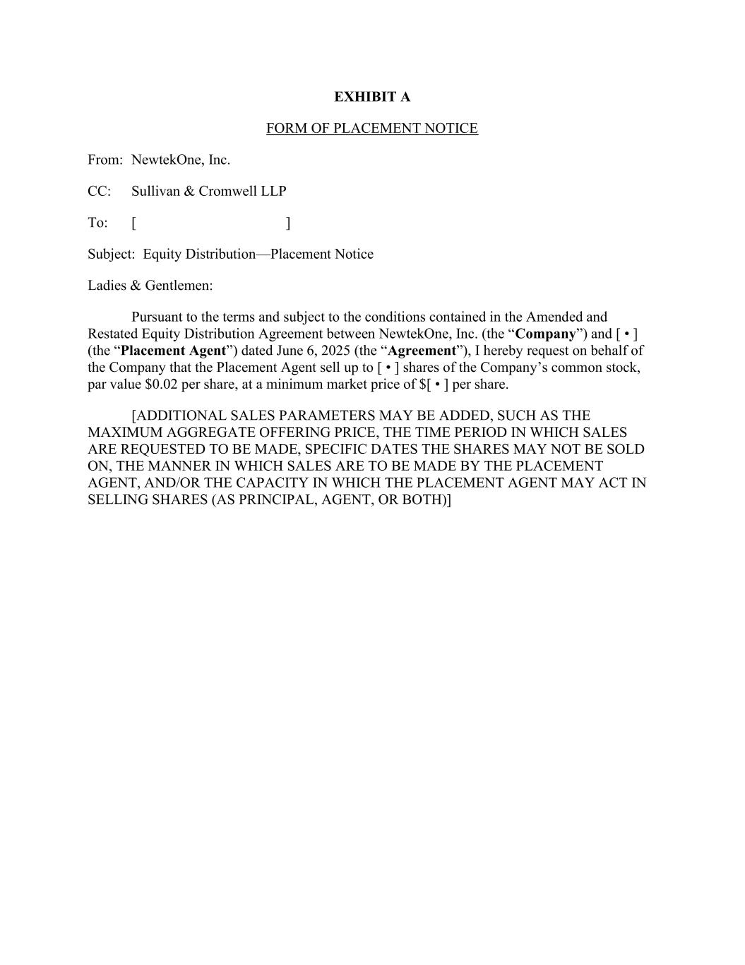 EXHIBIT A FORM OF PLACEMENT NOTICE From: NewtekOne, Inc. CC: Sullivan & Cromwell LLP To: [ ] Subject: Equity Distribution—Placement Notice Ladies & Gentlemen: Pursuant to the terms and subject to the conditions contained in the Amended and Restated Equity Distribution Agreement between NewtekOne, Inc. (the “Company”) and [ • ] (the “Placement Agent”) dated June 6, 2025 (the “Agreement”), I hereby request on behalf of the Company that the Placement Agent sell up to [ • ] shares of the Company’s common stock, par value $0.02 per share, at a minimum market price of $[ • ] per share. [ADDITIONAL SALES PARAMETERS MAY BE ADDED, SUCH AS THE MAXIMUM AGGREGATE OFFERING PRICE, THE TIME PERIOD IN WHICH SALES ARE REQUESTED TO BE MADE, SPECIFIC DATES THE SHARES MAY NOT BE SOLD ON, THE MANNER IN WHICH SALES ARE TO BE MADE BY THE PLACEMENT AGENT, AND/OR THE CAPACITY IN WHICH THE PLACEMENT AGENT MAY ACT IN SELLING SHARES (AS PRINCIPAL, AGENT, OR BOTH)]